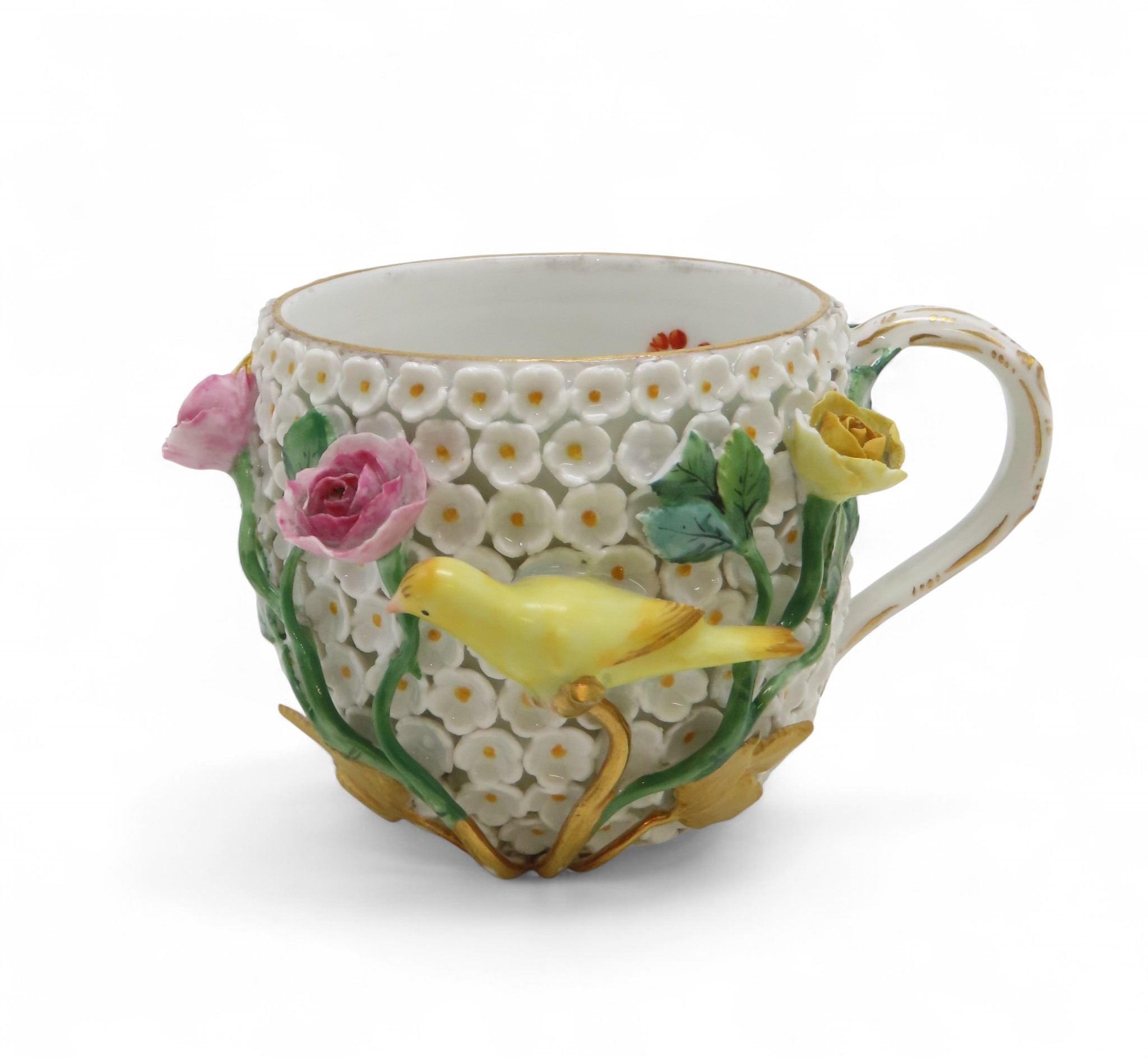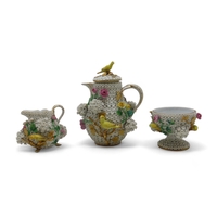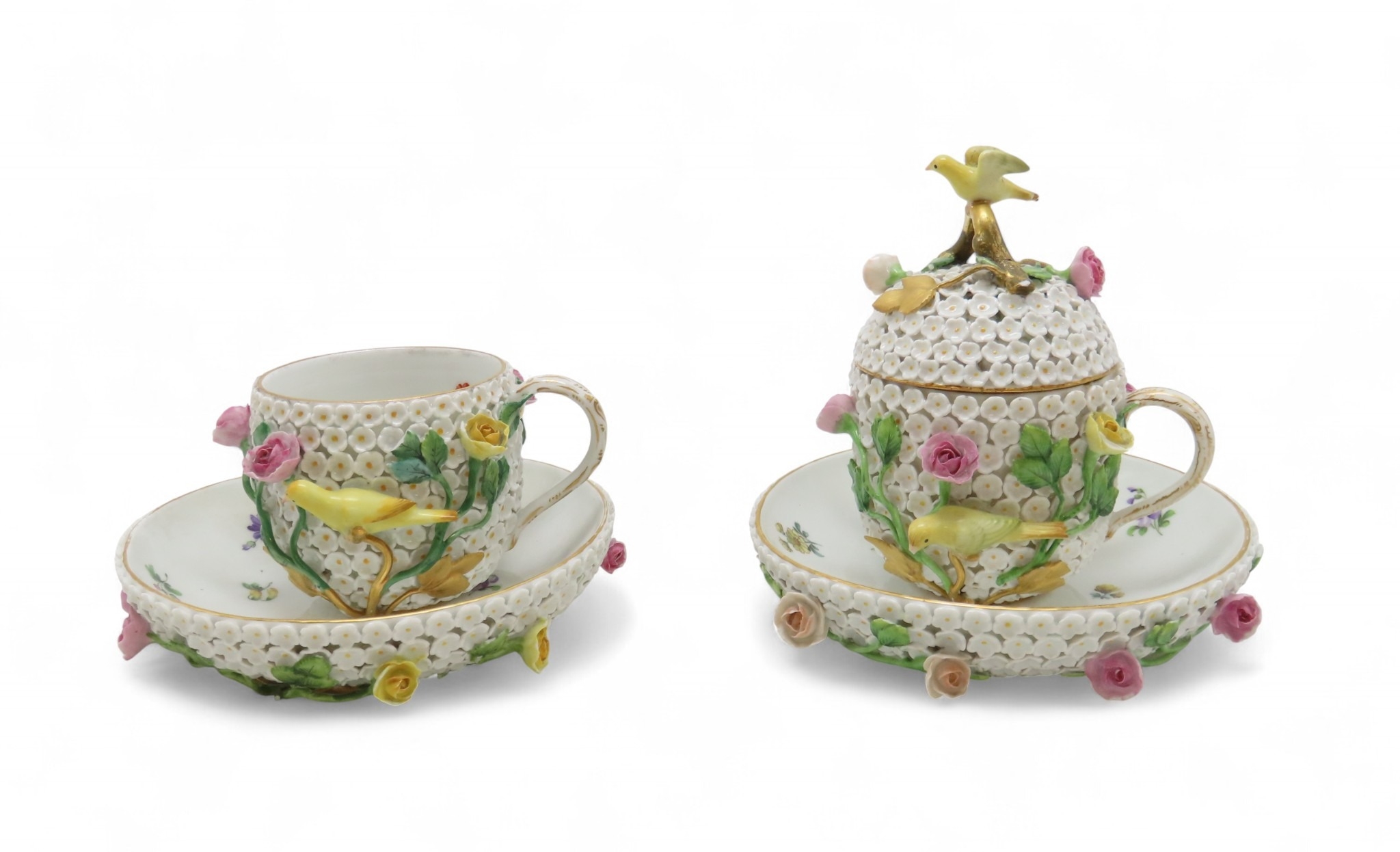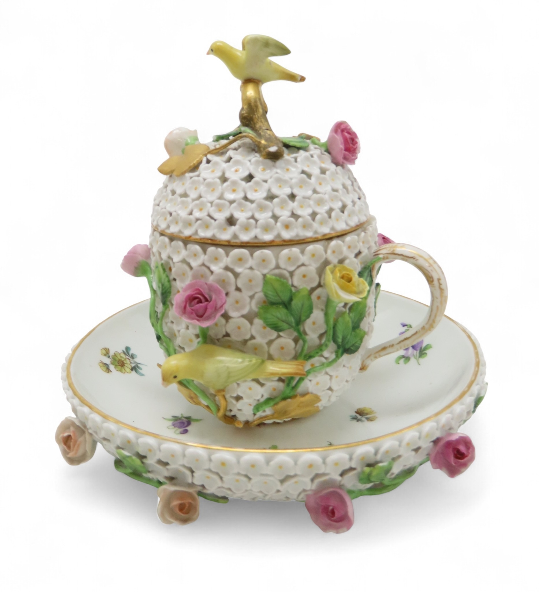 encrusted with small white flowers, applied roses and yellow birds, together with a cup and saucer, all with under glaze blue marks