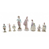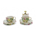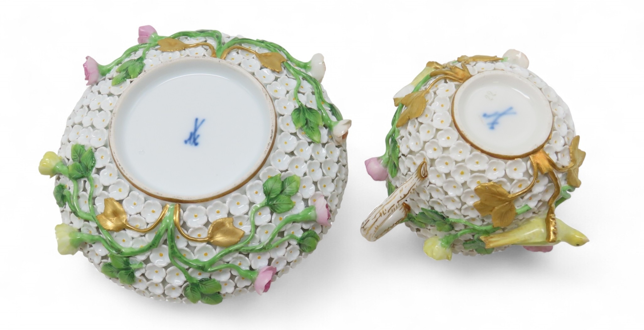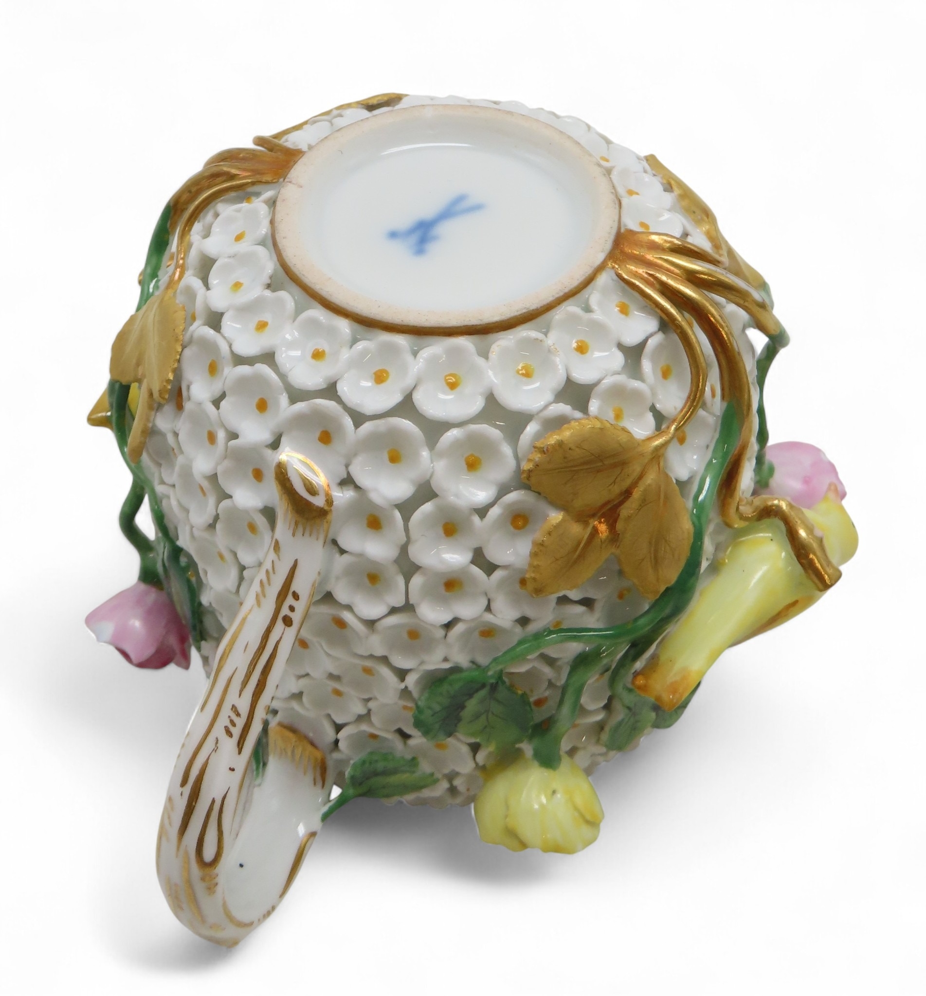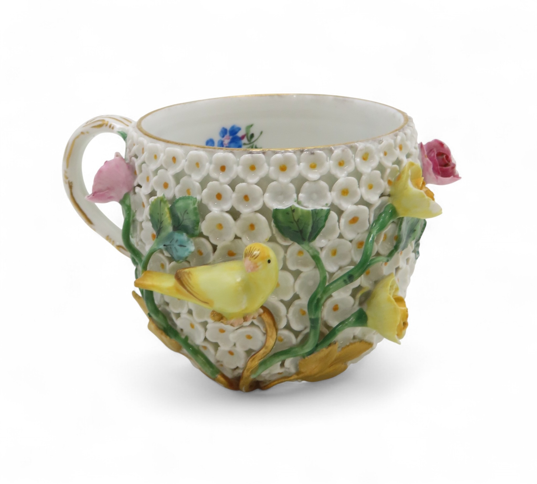 encrusted with small white flowers, applied roses and yellow birds, together with a cup and saucer, all with under glaze blue marks
