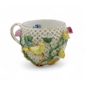 cup - one bird has chip under tail, the other chip to beak, some losses to flowers, leaves and stems. 6.5cm high. Mark has a score above it and number 22