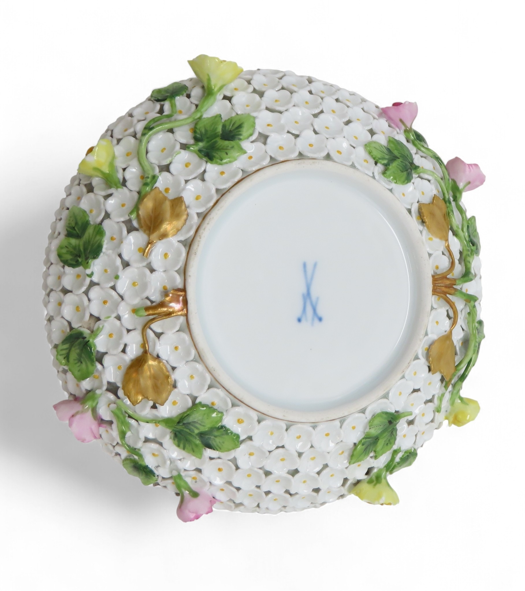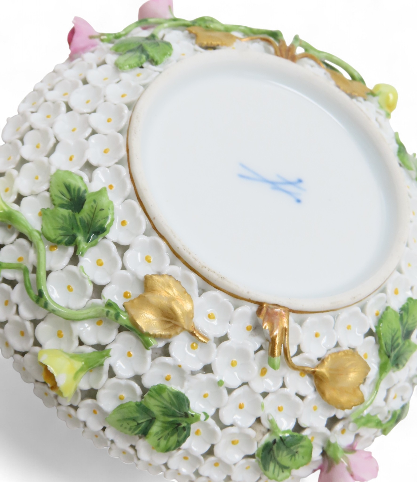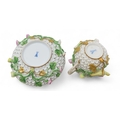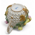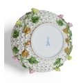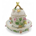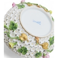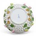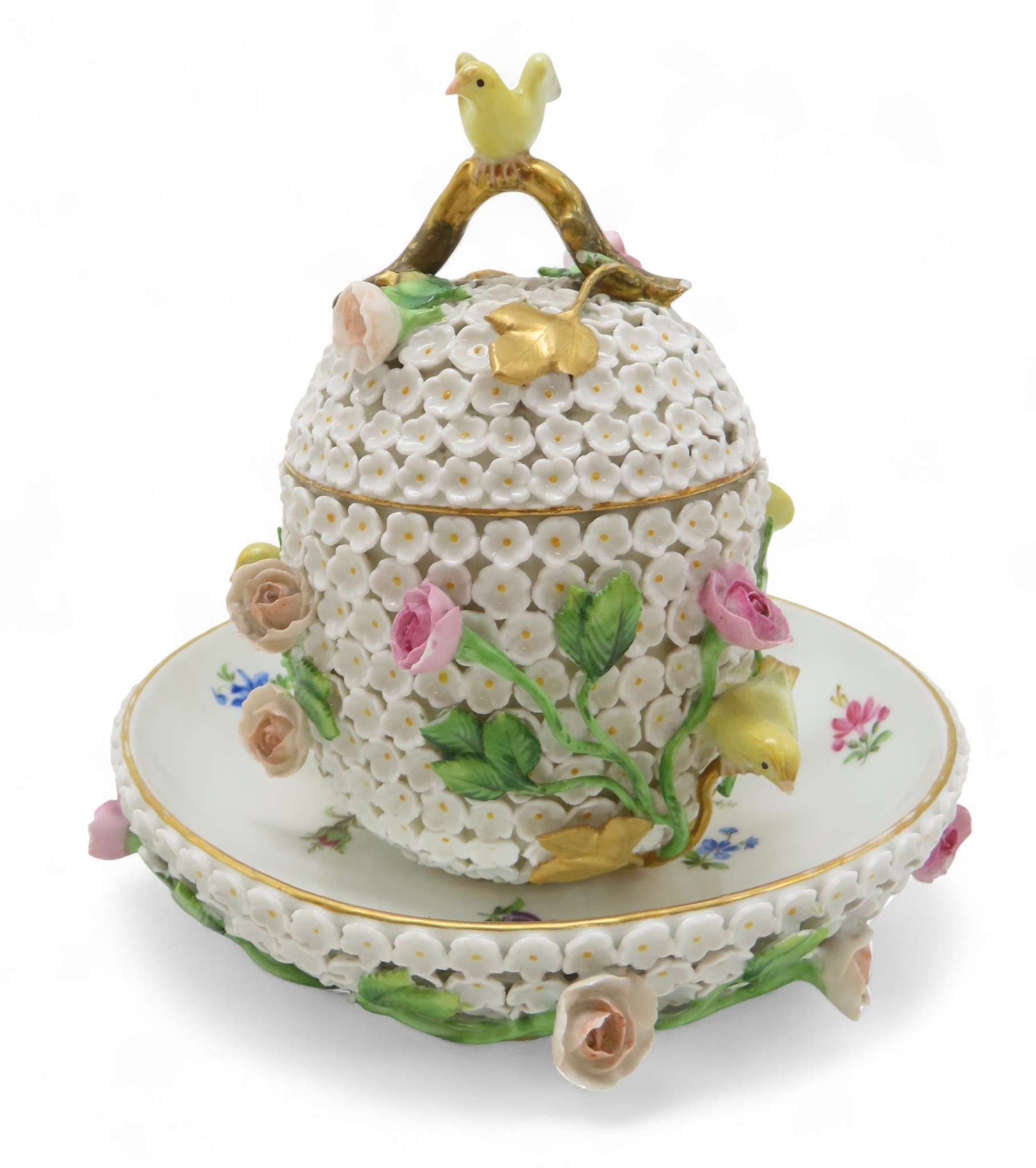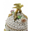 Lid - handle has been broken and repaired. End of birds tail missing and wings have been restored. Some losses to petals and stems, 6.5cm Stand - some losses to flowers and leaves14.5cm diameter