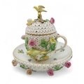 AN EARLY 20TH CENTURY MEISSEN SCHNEEBALLEN PORCELAIN CHOCOLATE CUP, COVER AND STAND