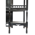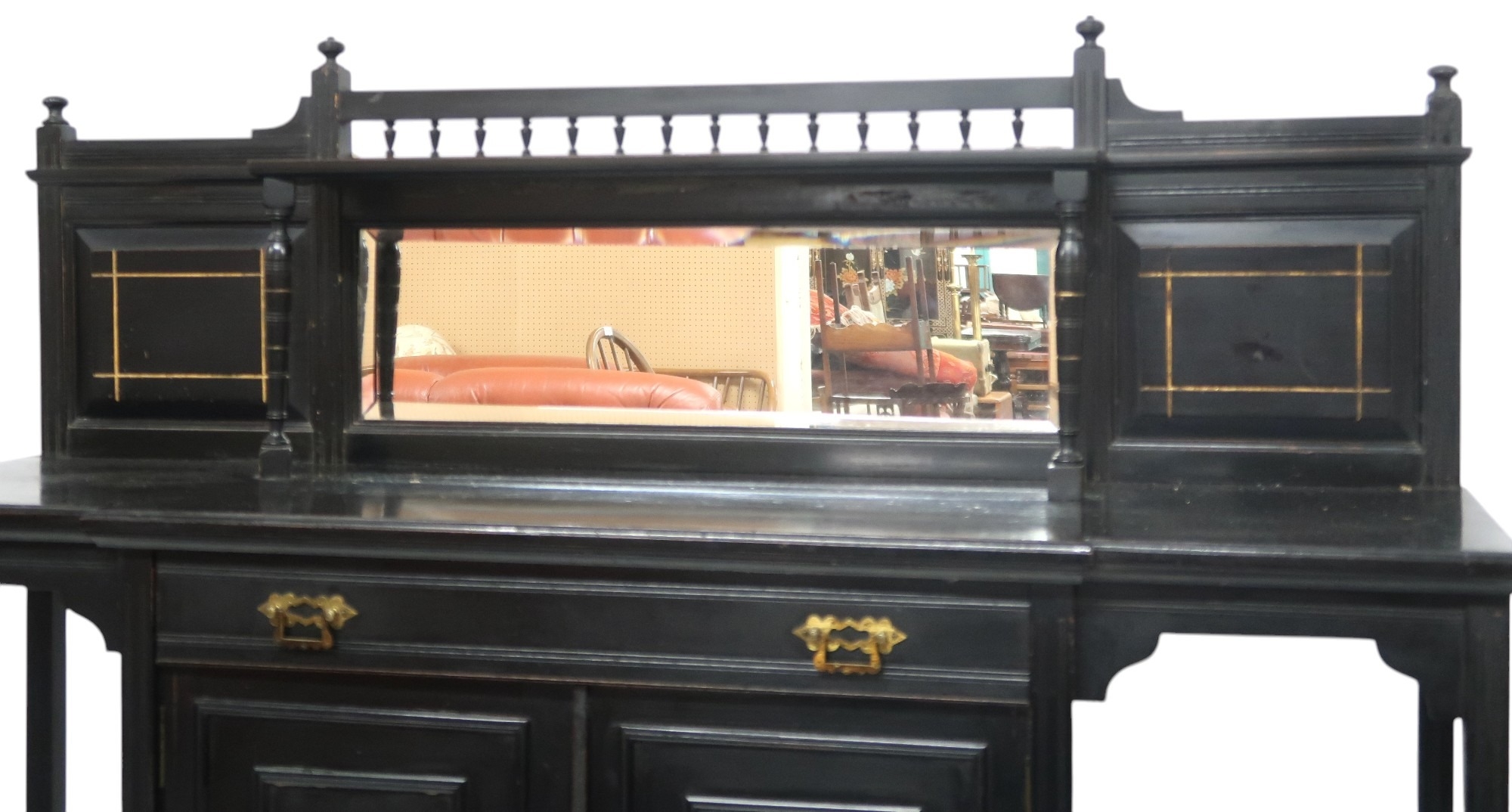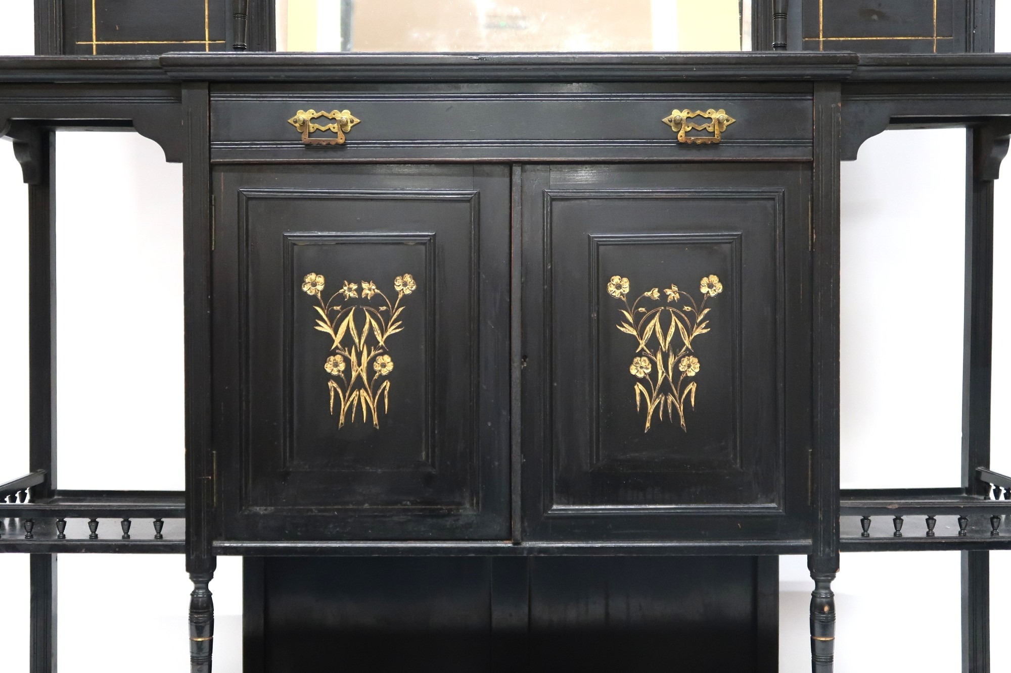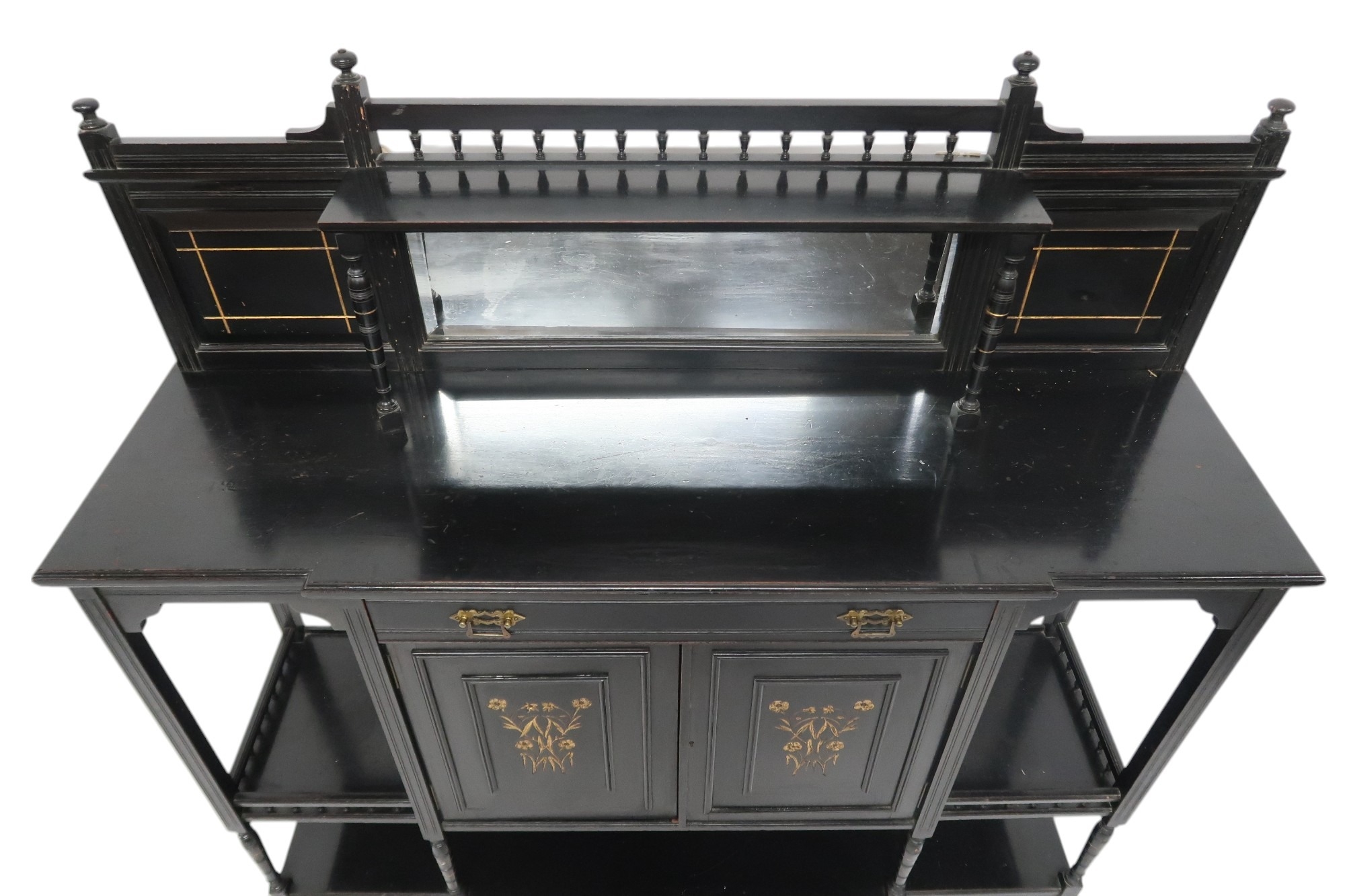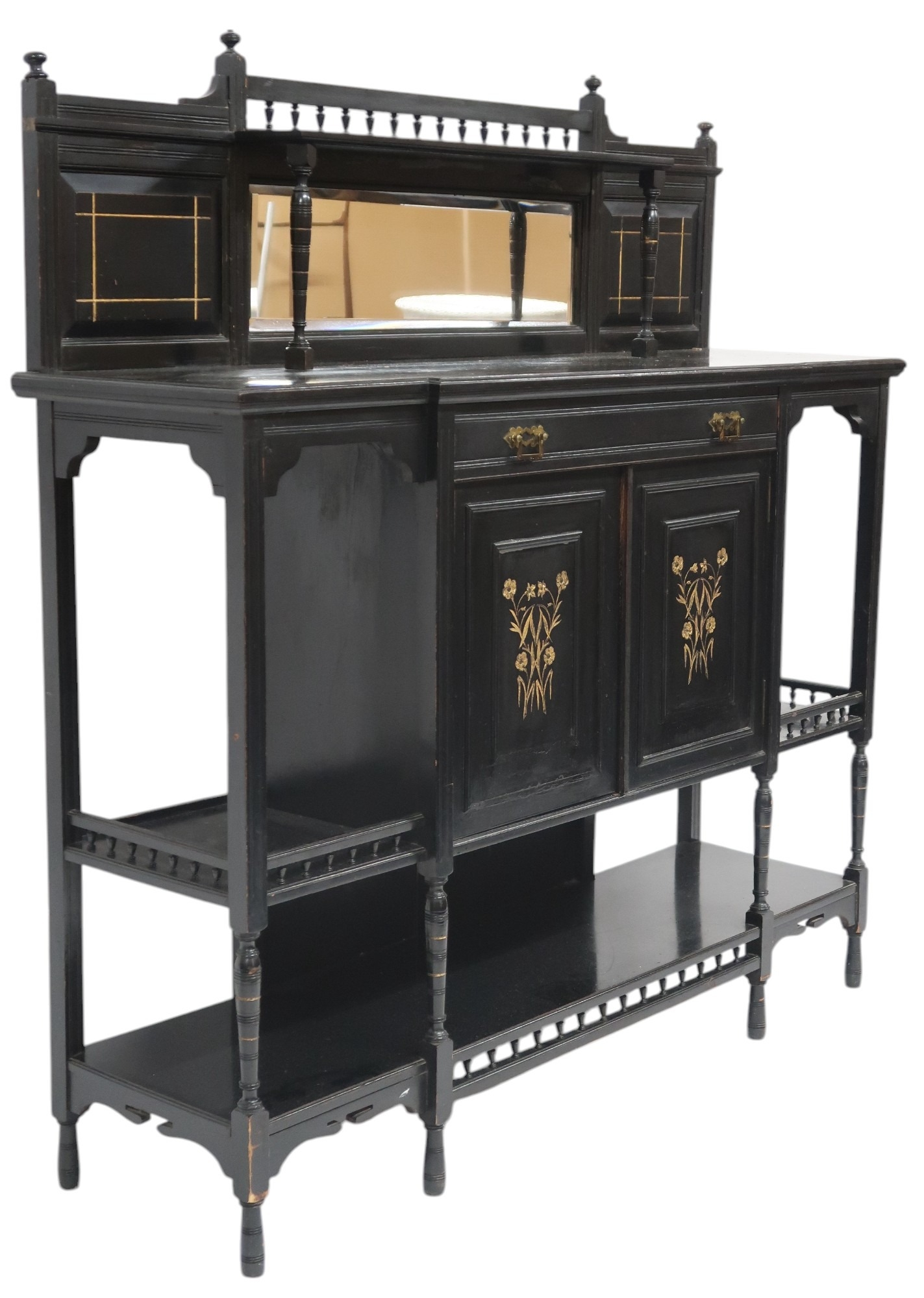 with galleried back with bevelled glass mirrored back over single drawer and pair of gilt floral decorated cabinet doors flanked by open shelves with gallery edges on turned supports joined by lower tiered shelf, 139cm high x 136cm wide x 39cm deep