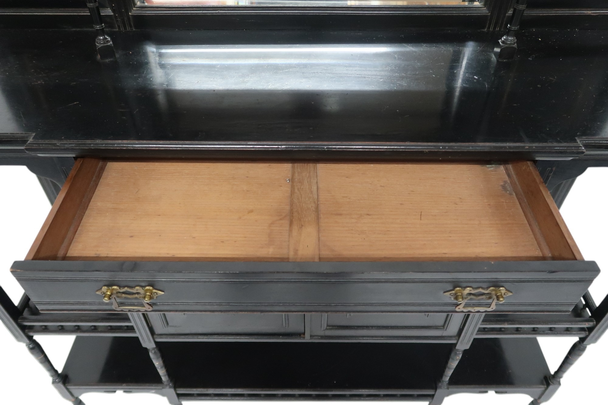 Overall good/ fair condition. structurally sound. Shows signs of historic woodworm. The end finials are replaced by door knobs. Scratches and marks to the surface top. Staining to the internal space. Signs of overpainting. Mirror appeared to be held to the back with the aid of parcel taped