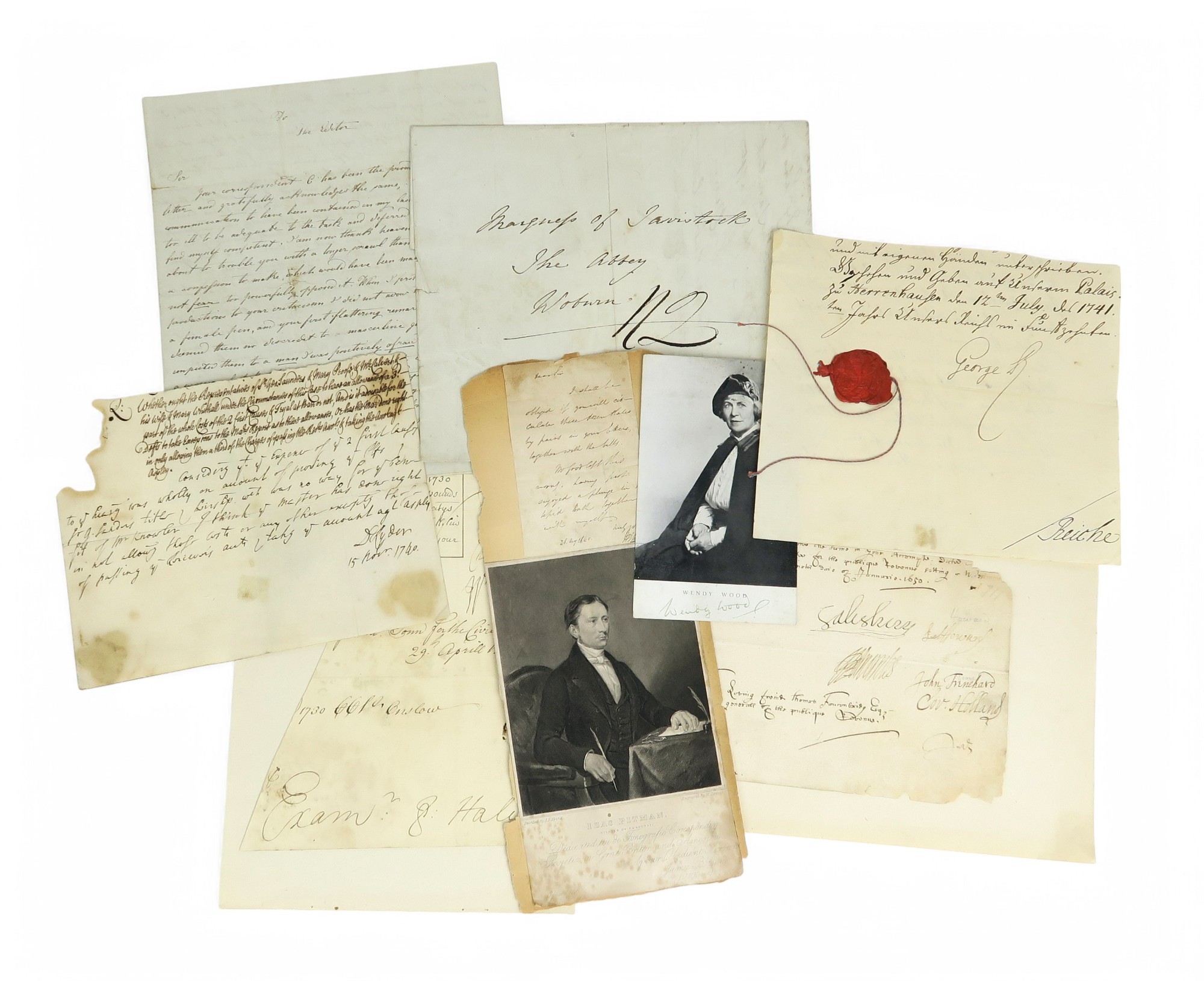 To include signatures of King George II (with wax seal), Robert Walpole (multiple), a portrait postcard signed by Wendy Wood, titled verso "Self Government for Scotland - Fight on!" etc.