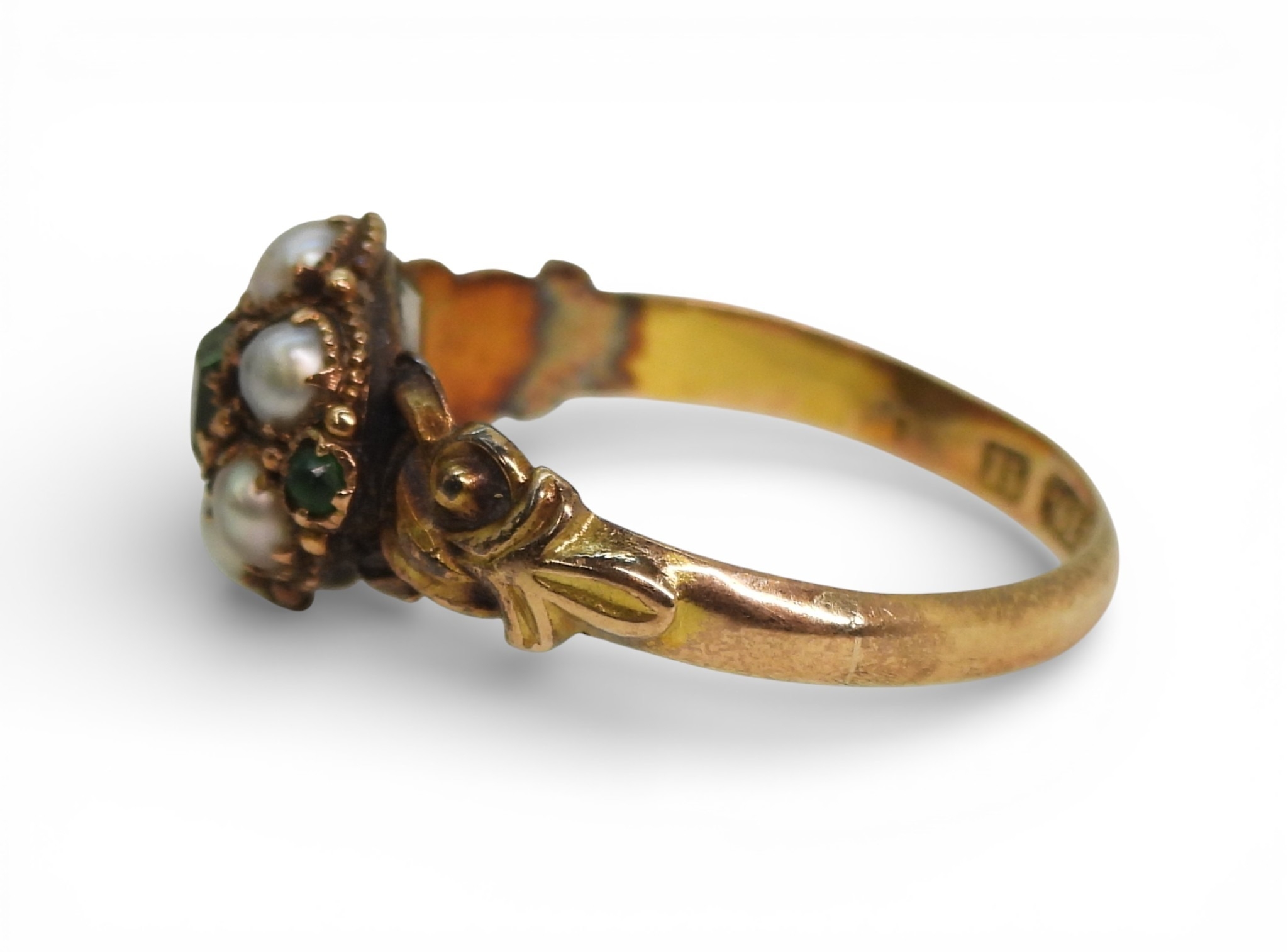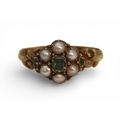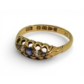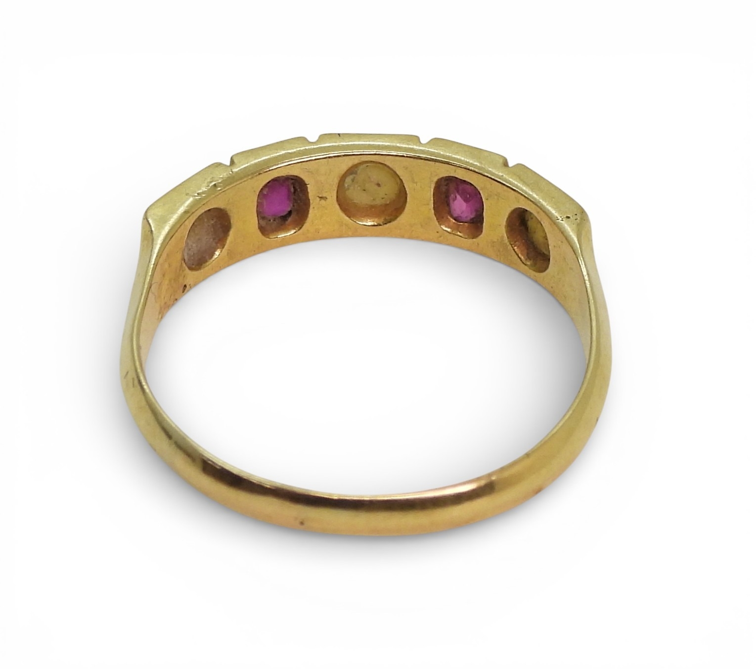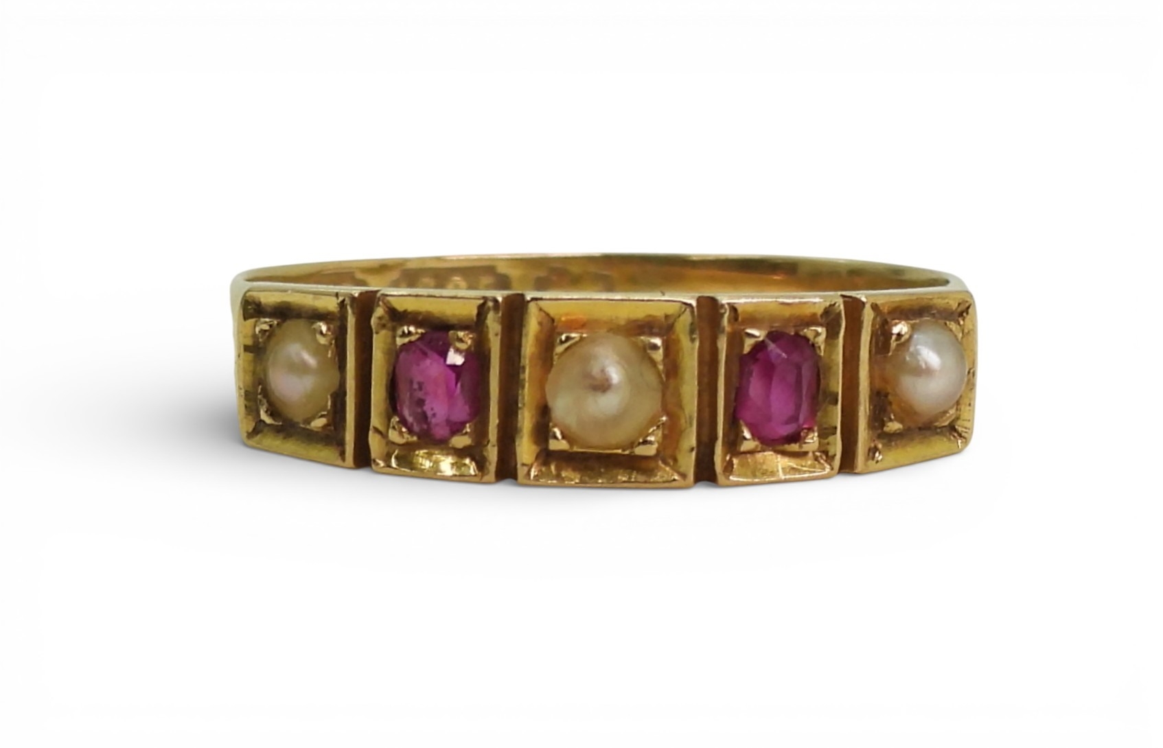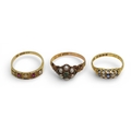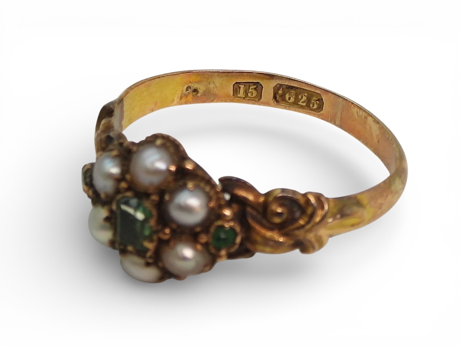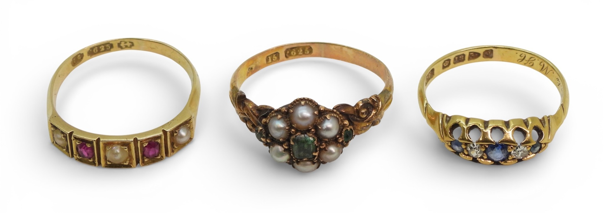 an 1863 sapphire and diamond five stone ring, size M, weight 2.4gms, size M, a 15ct gold ruby and pearl ring, with partial Birmingham hall marks, size P1/2 approx, and a 15ct gold pearl and emerald flower ring with locket back, size O1/2, weight with previous ring 4.8gms