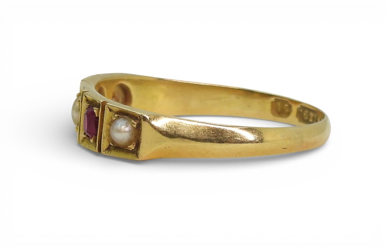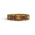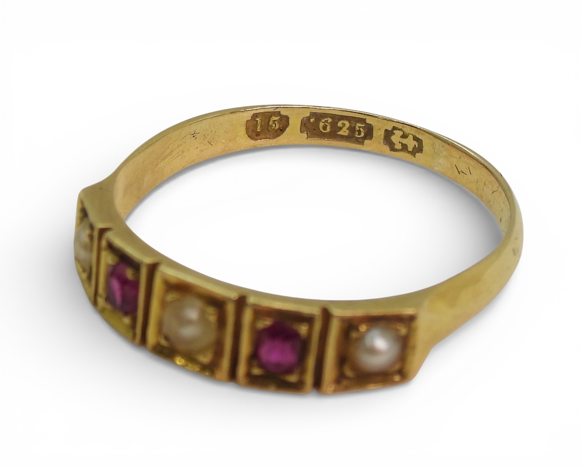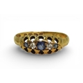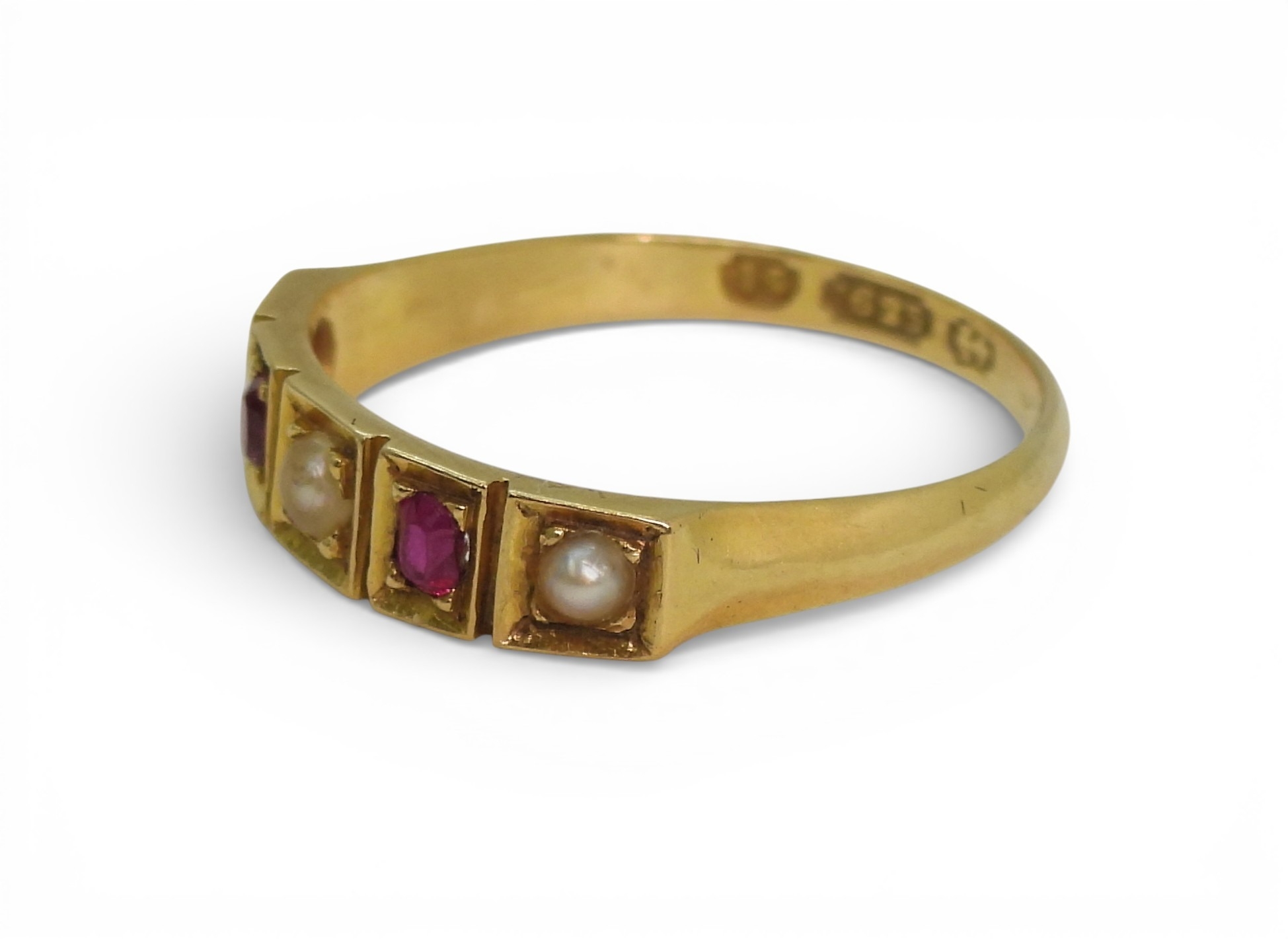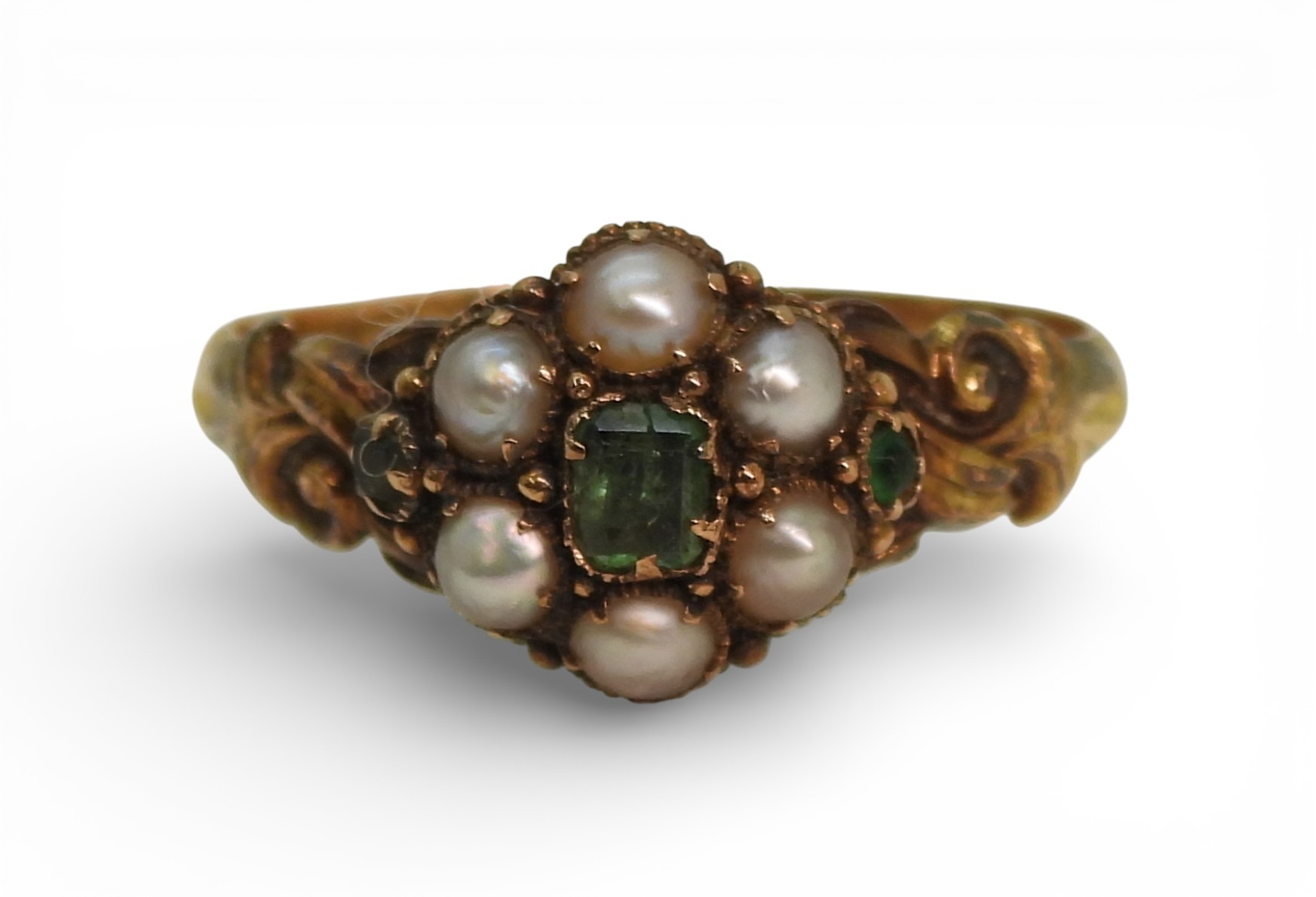 an 1863 sapphire and diamond five stone ring, size M, weight 2.4gms, size M, a 15ct gold ruby and pearl ring, with partial Birmingham hall marks, size P1/2 approx, and a 15ct gold pearl and emerald flower ring with locket back, size O1/2, weight with previous ring 4.8gms