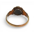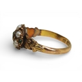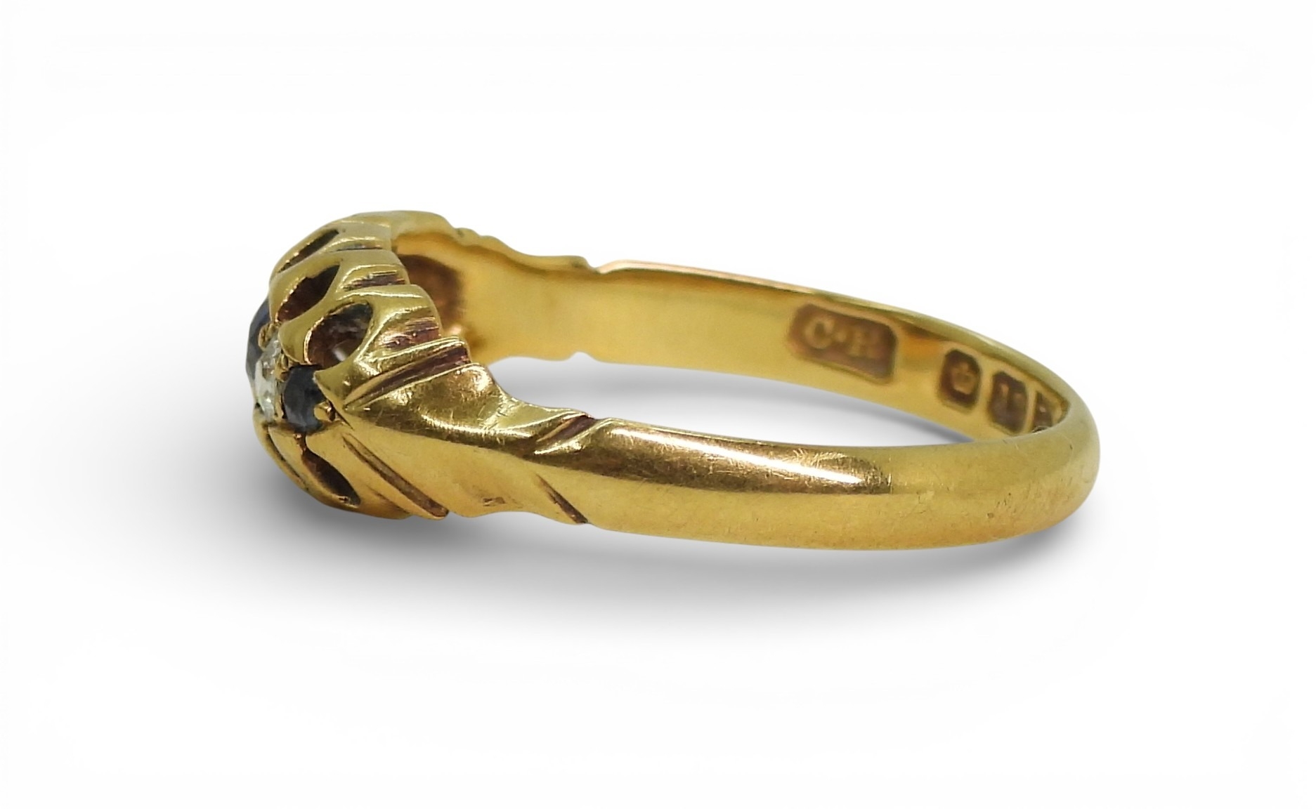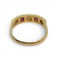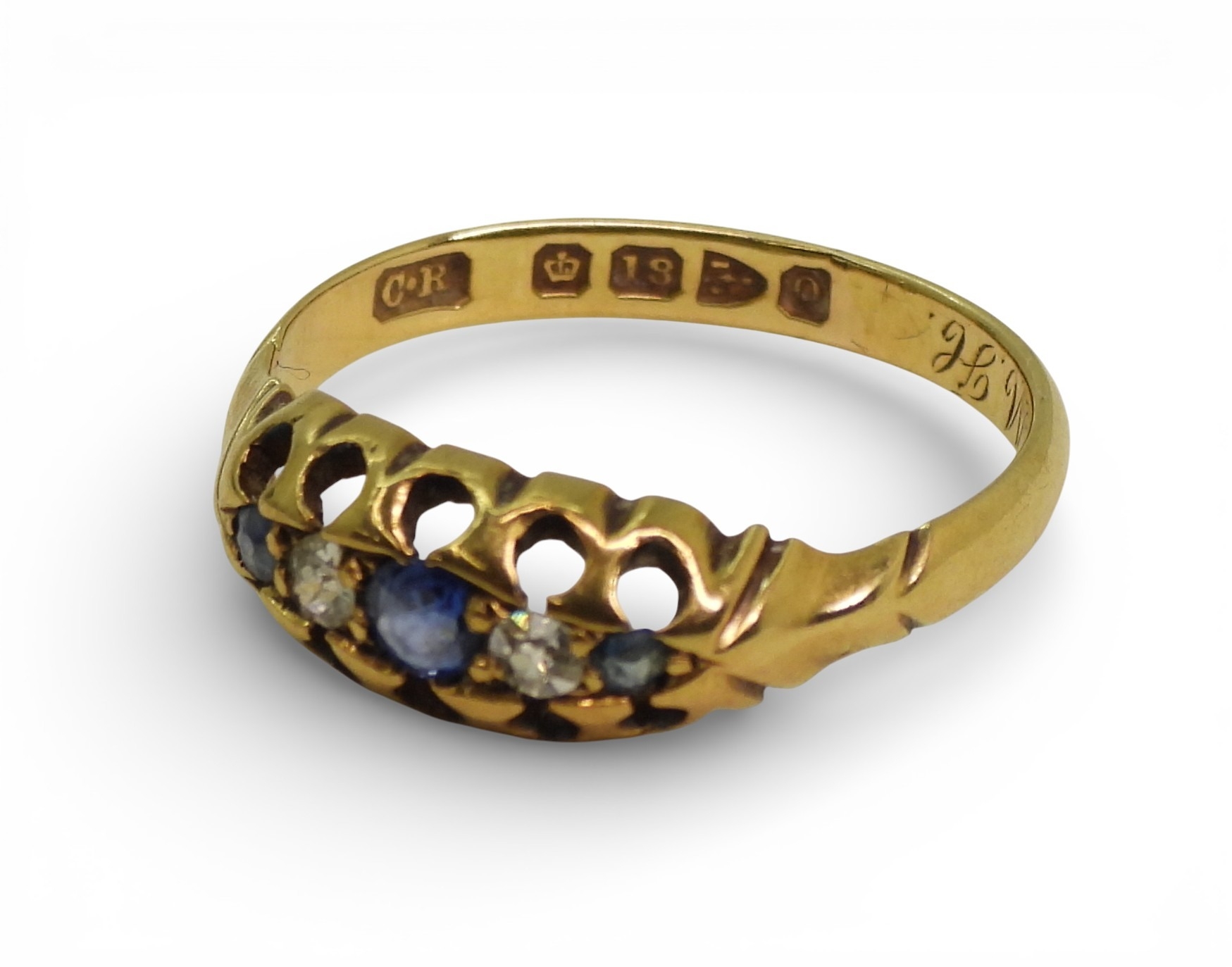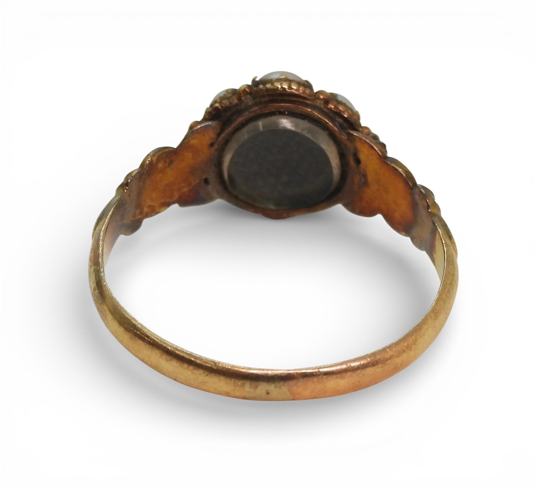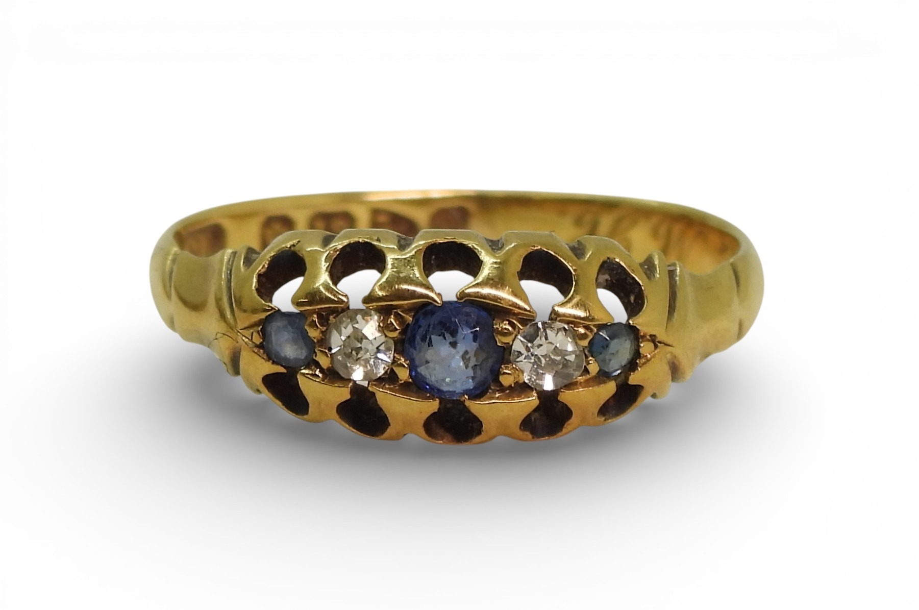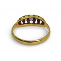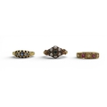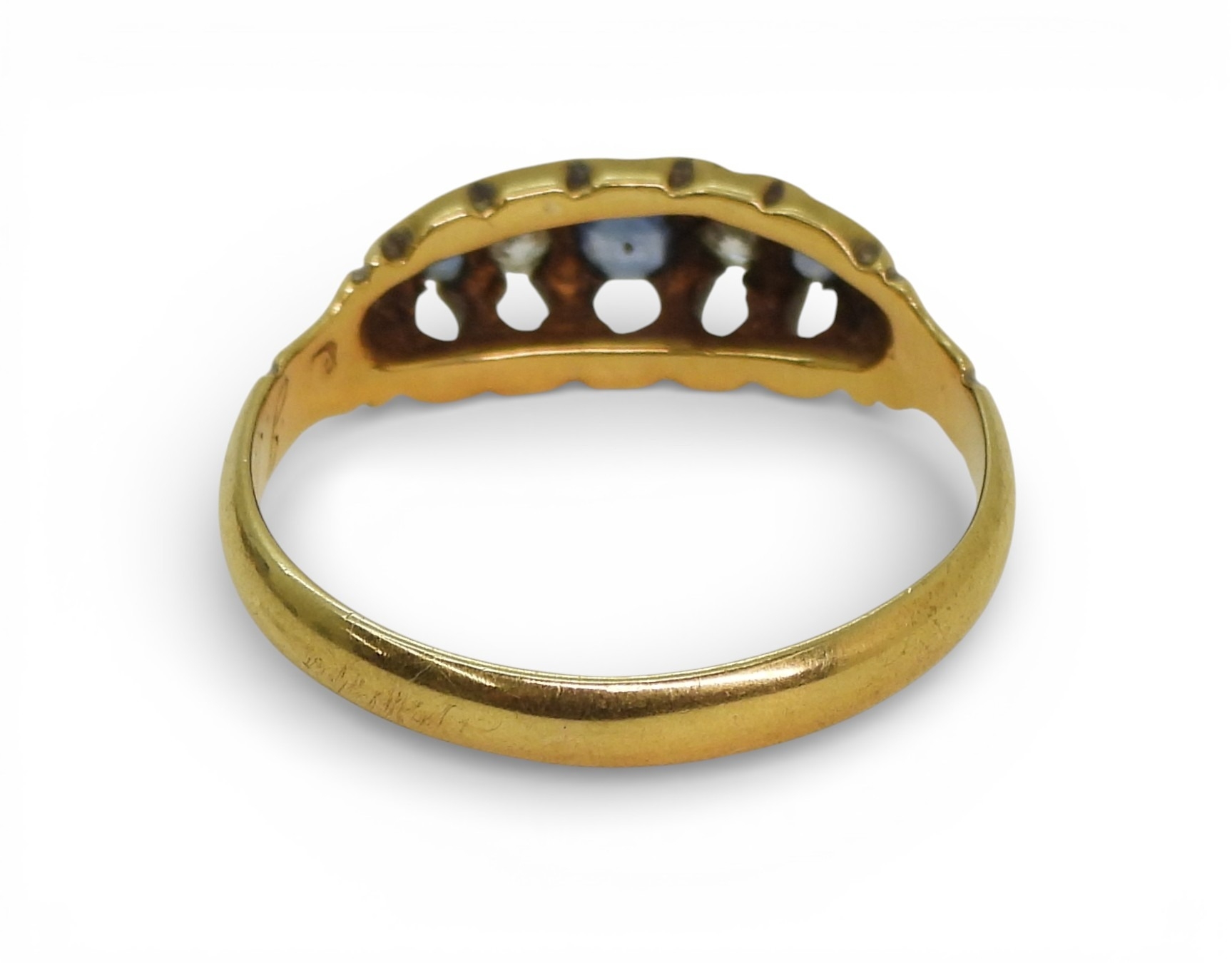 an 1863 sapphire and diamond five stone ring, size M, weight 2.4gms, size M, a 15ct gold ruby and pearl ring, with partial Birmingham hall marks, size P1/2 approx, and a 15ct gold pearl and emerald flower ring with locket back, size O1/2, weight with previous ring 4.8gms