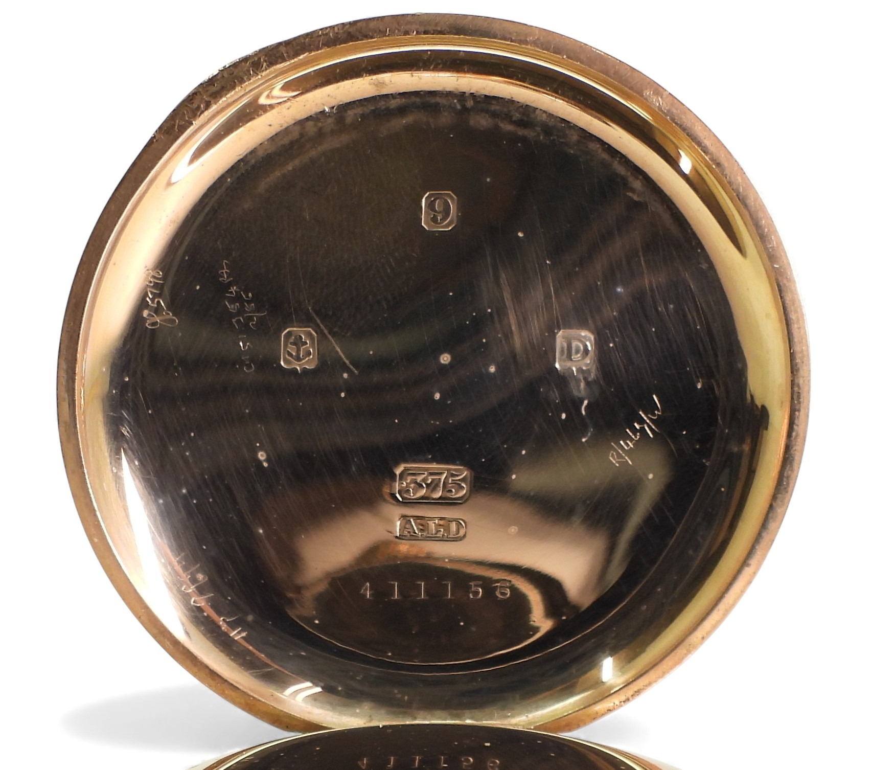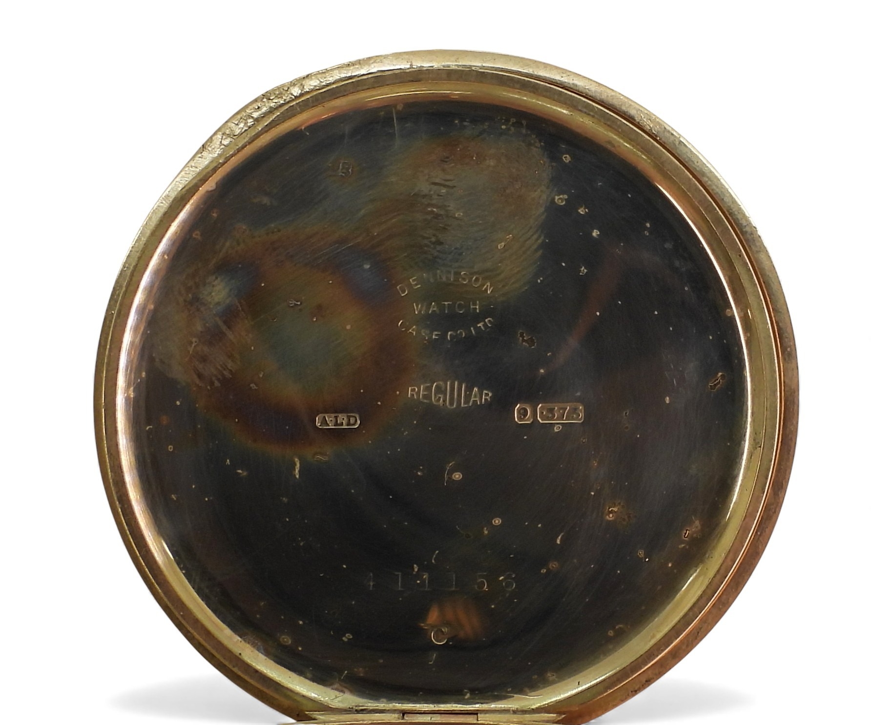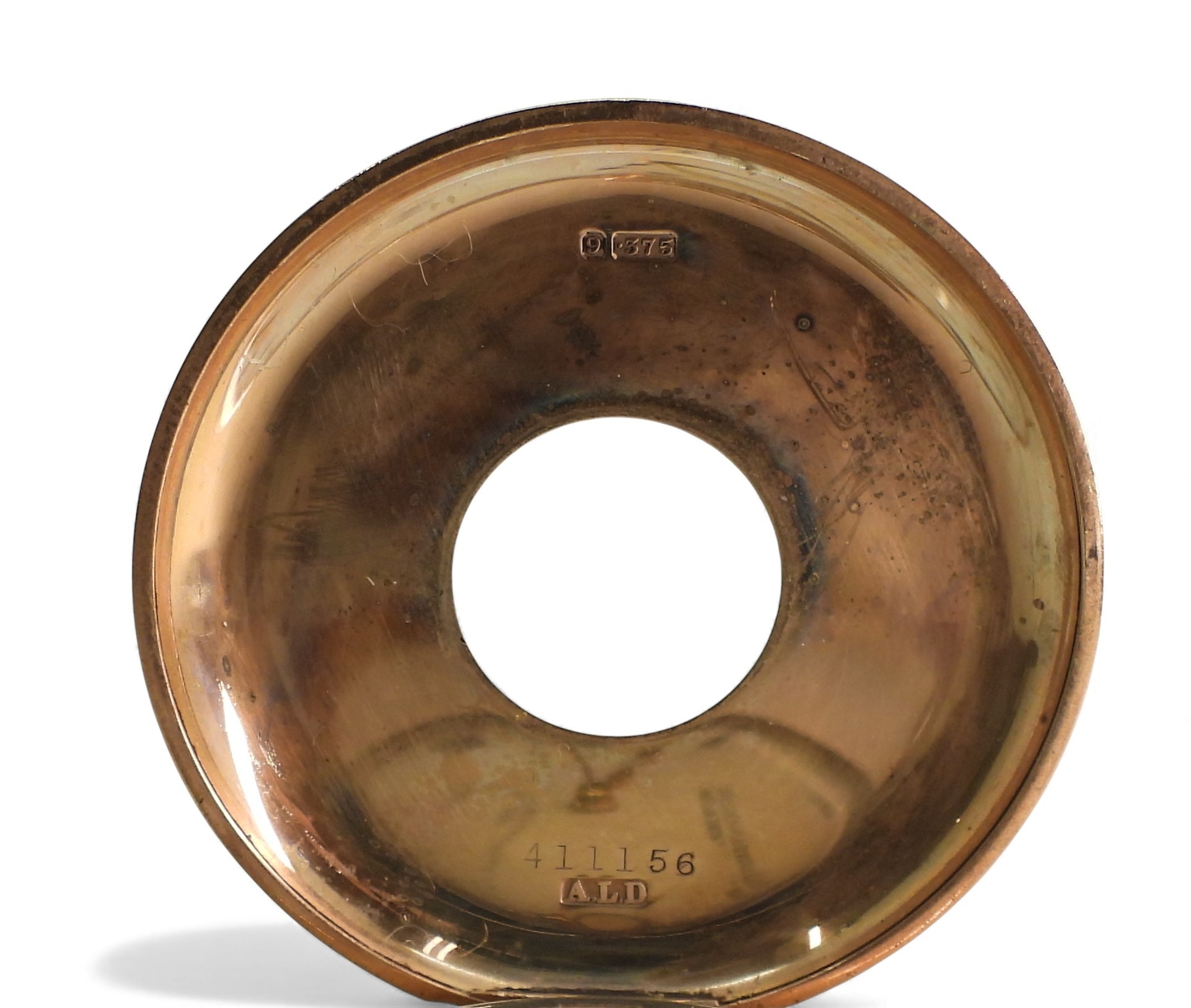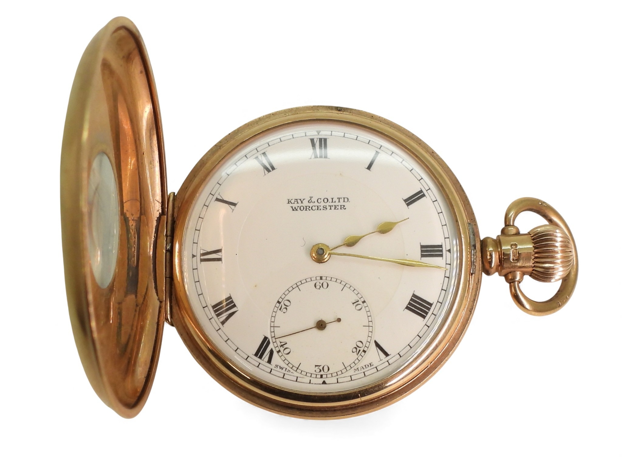 with white enamel dial, subsidiary seconds dial, black Roman numerals and gold coloured hands. The dial signed Kay & Co Worcester. Port hole glass intact. Black enamel chapter ring. Birmingham hallmarks for 1928. Diameter 5cm, weight including mechanism 96.9gms