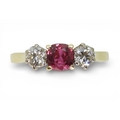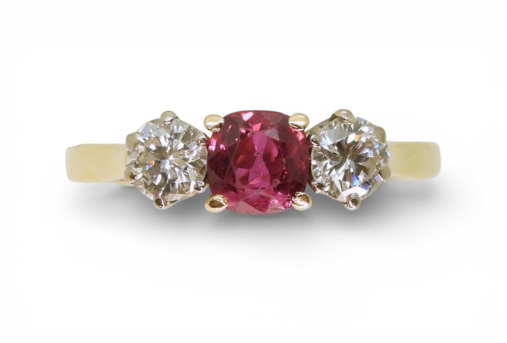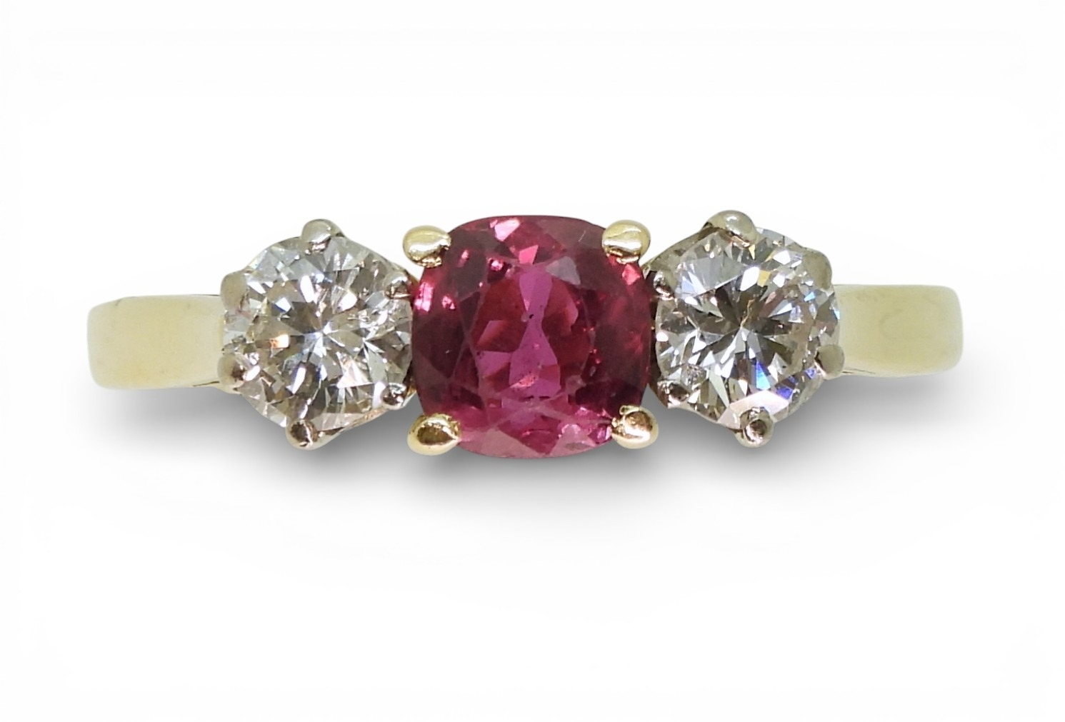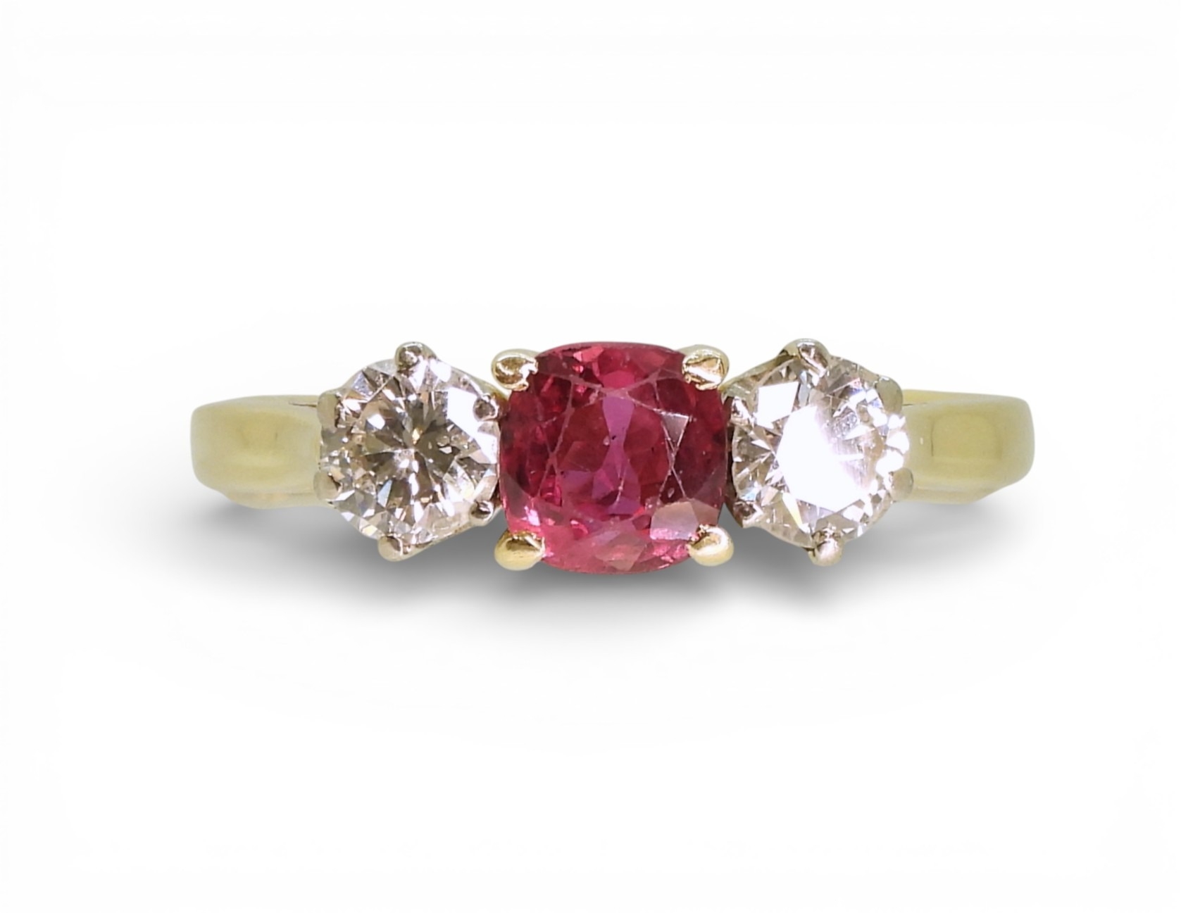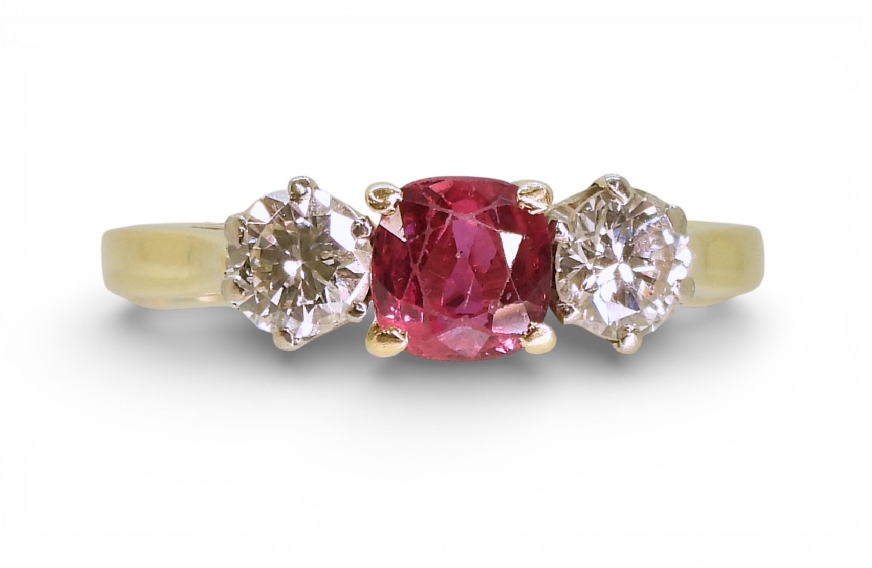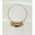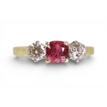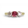 in 18ct yellow and white gold, set with a cushion cut ruby of approx 5.4mm x 5.4mm x 2.9mm. Flanked by two estimated approx diamonds of 0.30cts. Finger size S, weight 3.4gms