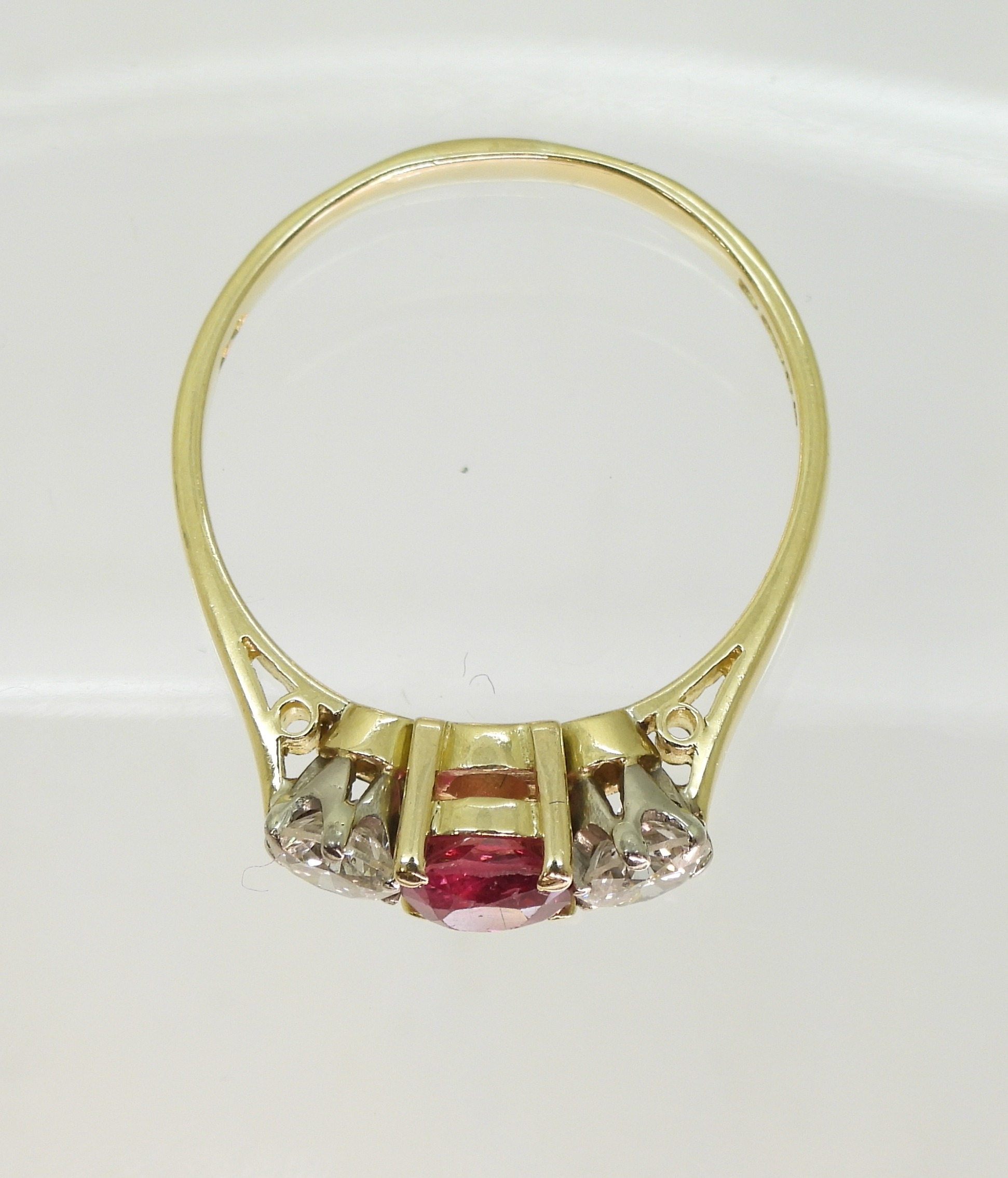 light general wear, Diamonds both have a couple of tiny carbon dots, and a couple of clear feather type inclusions, ruby has some abrasions to the top facets and a couple of crystal inclusions, please see condition report images