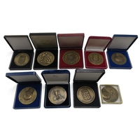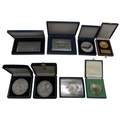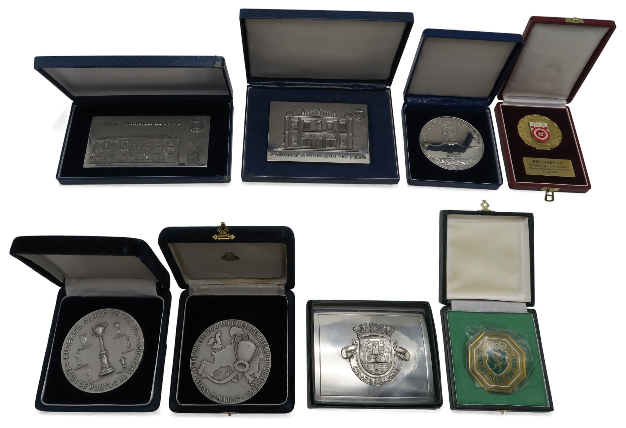 Five Portuguese football commemorative medallions, including Porto European Cup 1987 and Taca de Portugal 1999/2000 examples, a Portuguese Football Federation medallion engraved "XII Belgica/Portugal "AA" Charleroi 23-02-2000"; together with two large 97% tin plaques commemorating Portuguese regional governmental architecture; and a dome-top cigarette case, also in 97% tin (8)