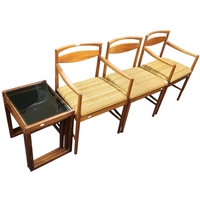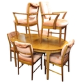 A mid 20th century teak McIntosh extending dining table and six chairs, table with oval top concealing internal leaf on shaped tapering supports, 76cm high x 152cm long (197cm long extended) x 95cm deep and chairs with button upholstered backs and seats on cylindrical supports, 87cm (7)