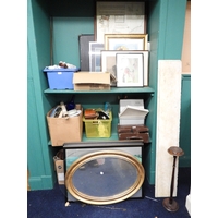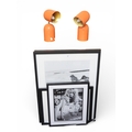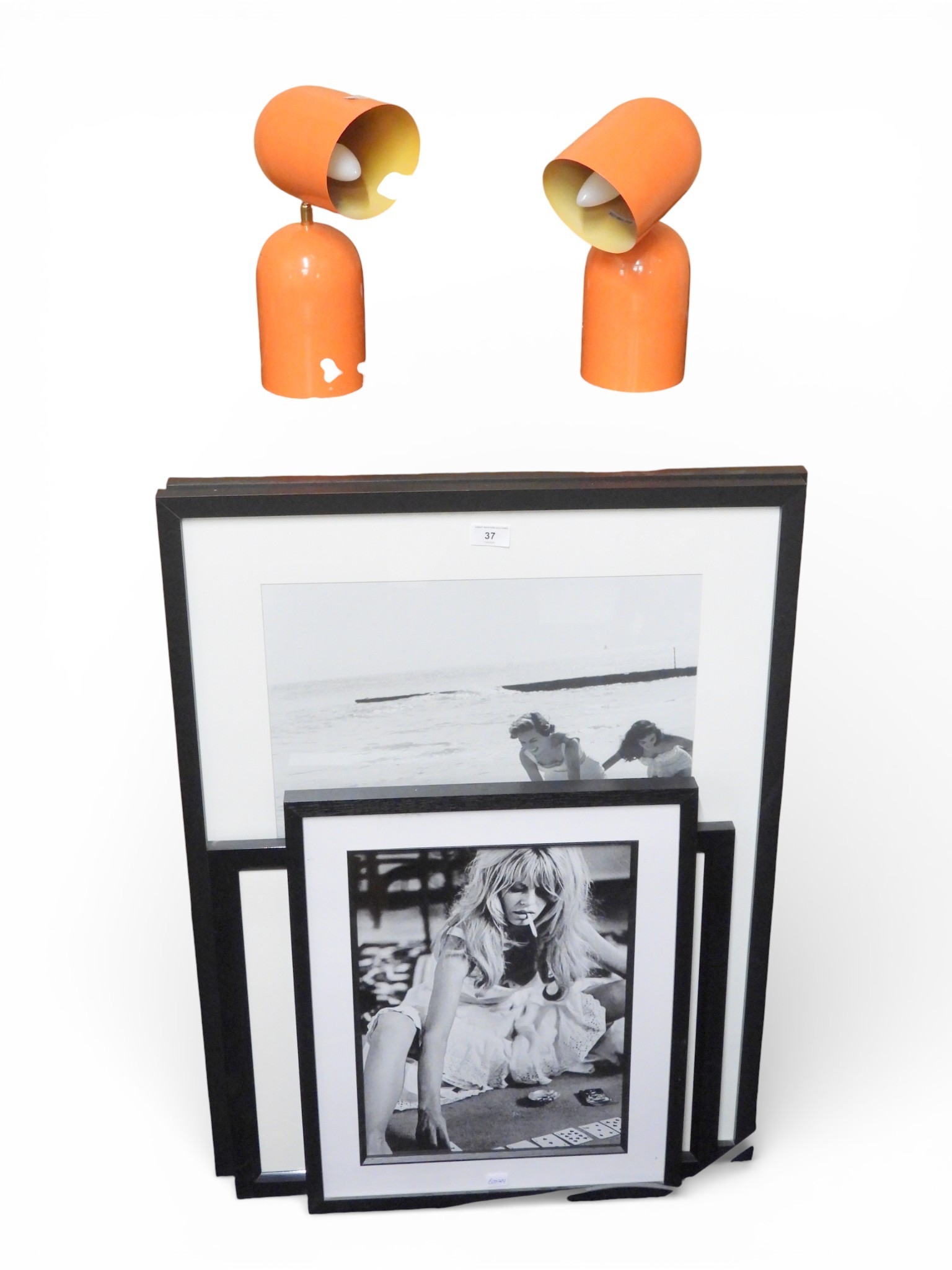A lot comprising a pair of contemporary orange retro style adjustable table lamp and four assorted framed black and white prints of photographs circa 1950s (6)