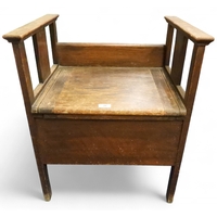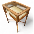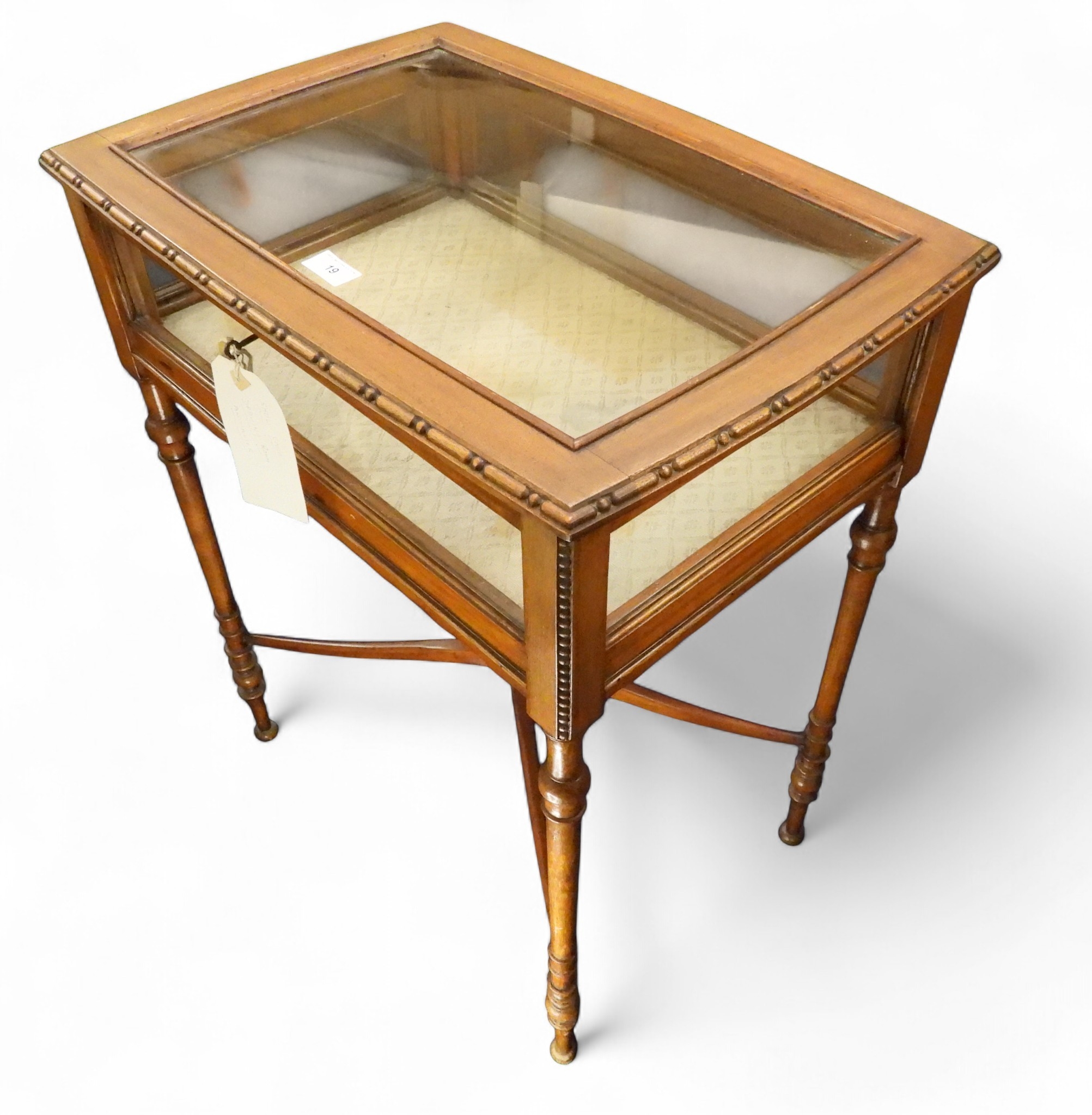 An early to mid 20th century mahogany bijouterie table with hinged glass top and sides on turned supports joined by crossed stretcher, 73cm high x 60cm wide x 42cm deep
