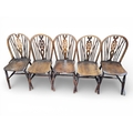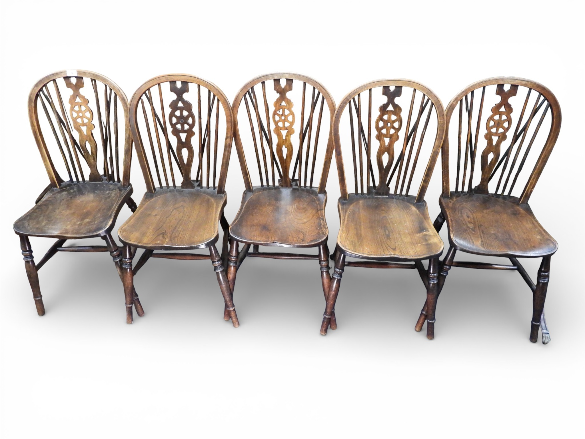 A set of five 20th century elm wheelback Windsor style dining chairs with shaped seats on turned supports joined by H stretchers, 91cm high (5)