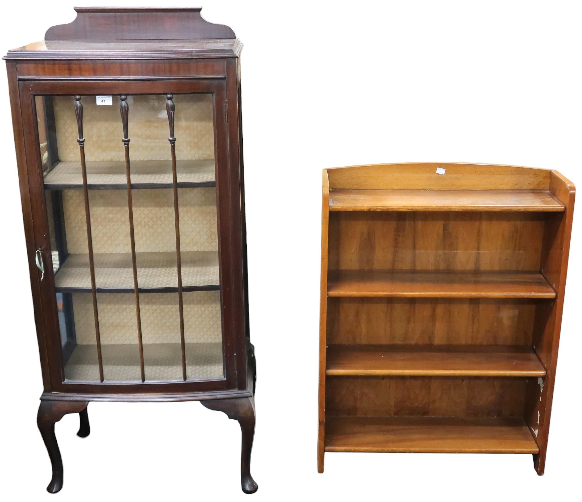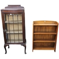 A lot comprising early 20th century mahogany glazed display cabinet, 135cm high x 58cm wide x 35cm deep and a small four shelf open bookcase, 92cm high x 69cm wide x 20cm deep (2)