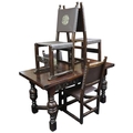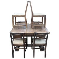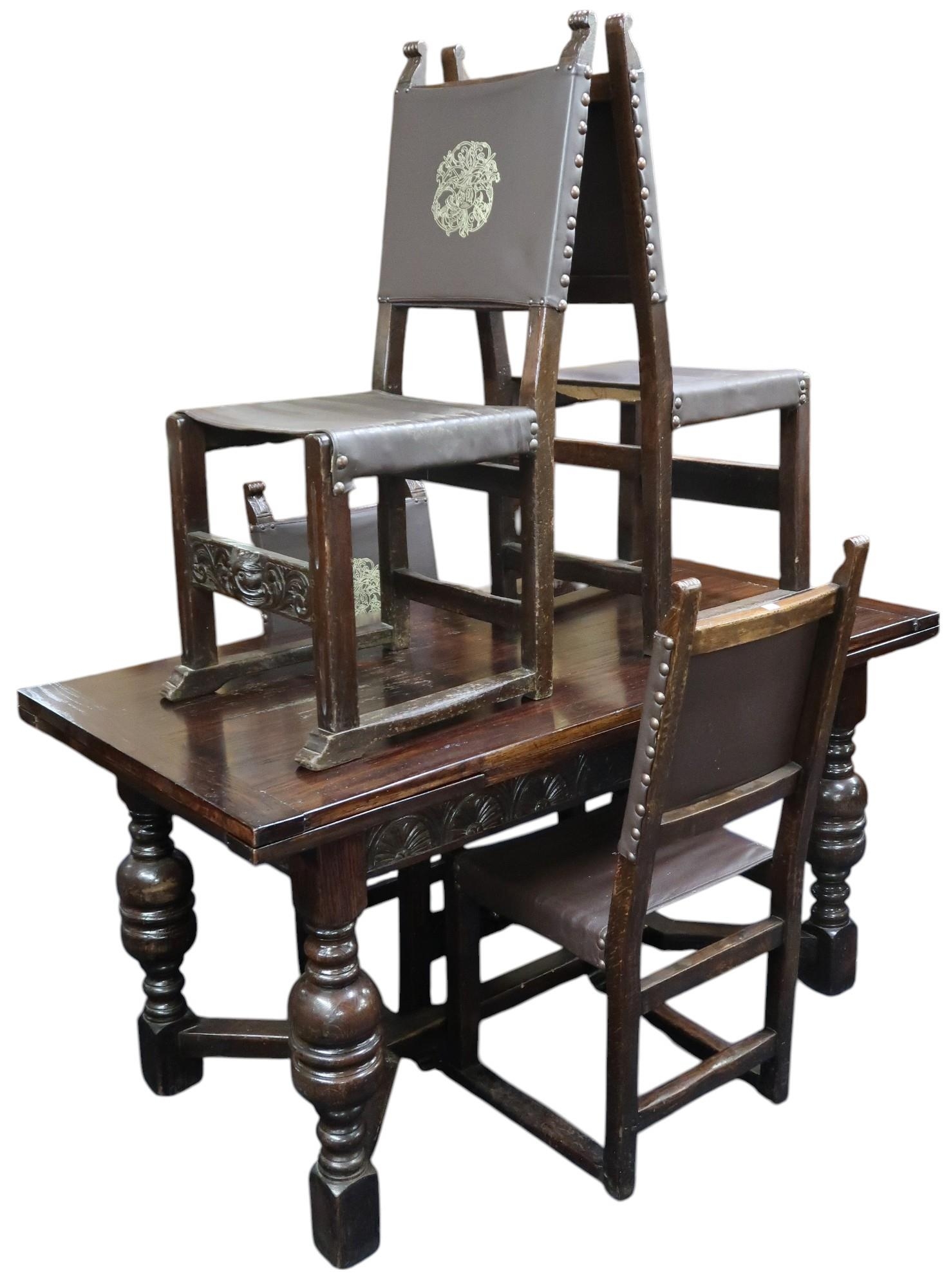 A 20th century stained elm extending dining table and four chairs, table with rectangular pull out top on turned baluster supports, 79cm high x 152cm long (228cm extended) x 79cm deep and chairs with leather upholstered backs and seats on square supports, 104cm high (5)