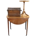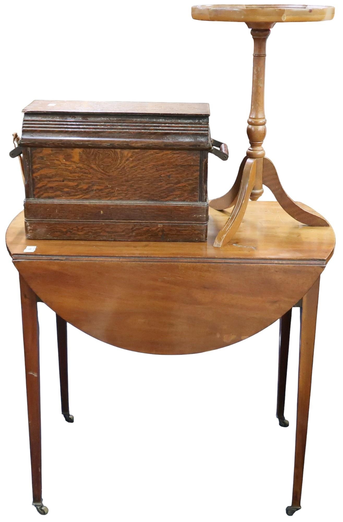 A lot comprising a Victorian mahogany Pembroke table, oak cased portable sewing machine and a tripod based wine table (3)