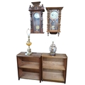 A lot comprising two mid 20th century open bookcases, two assorted Austrian style wall clocks and two assorted table lamps (6)