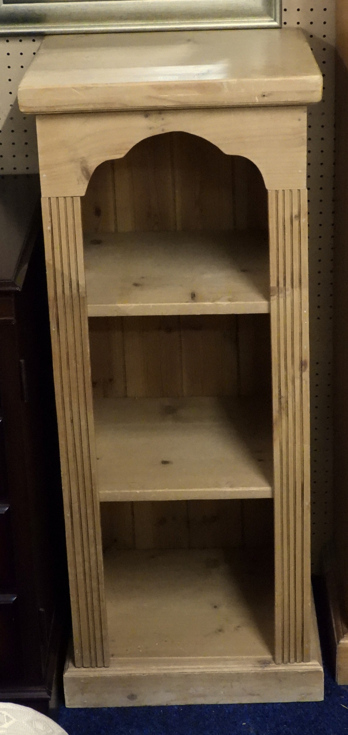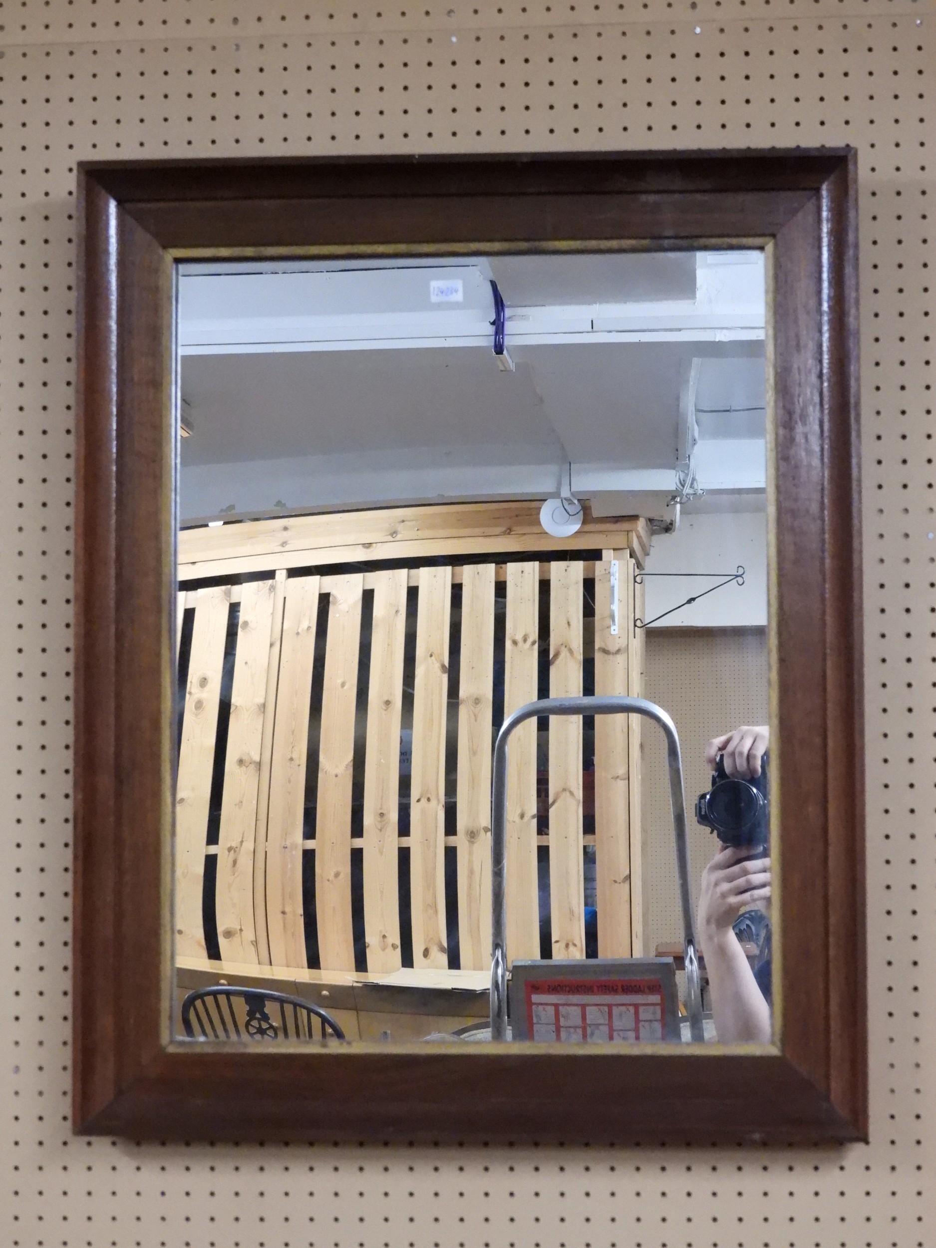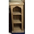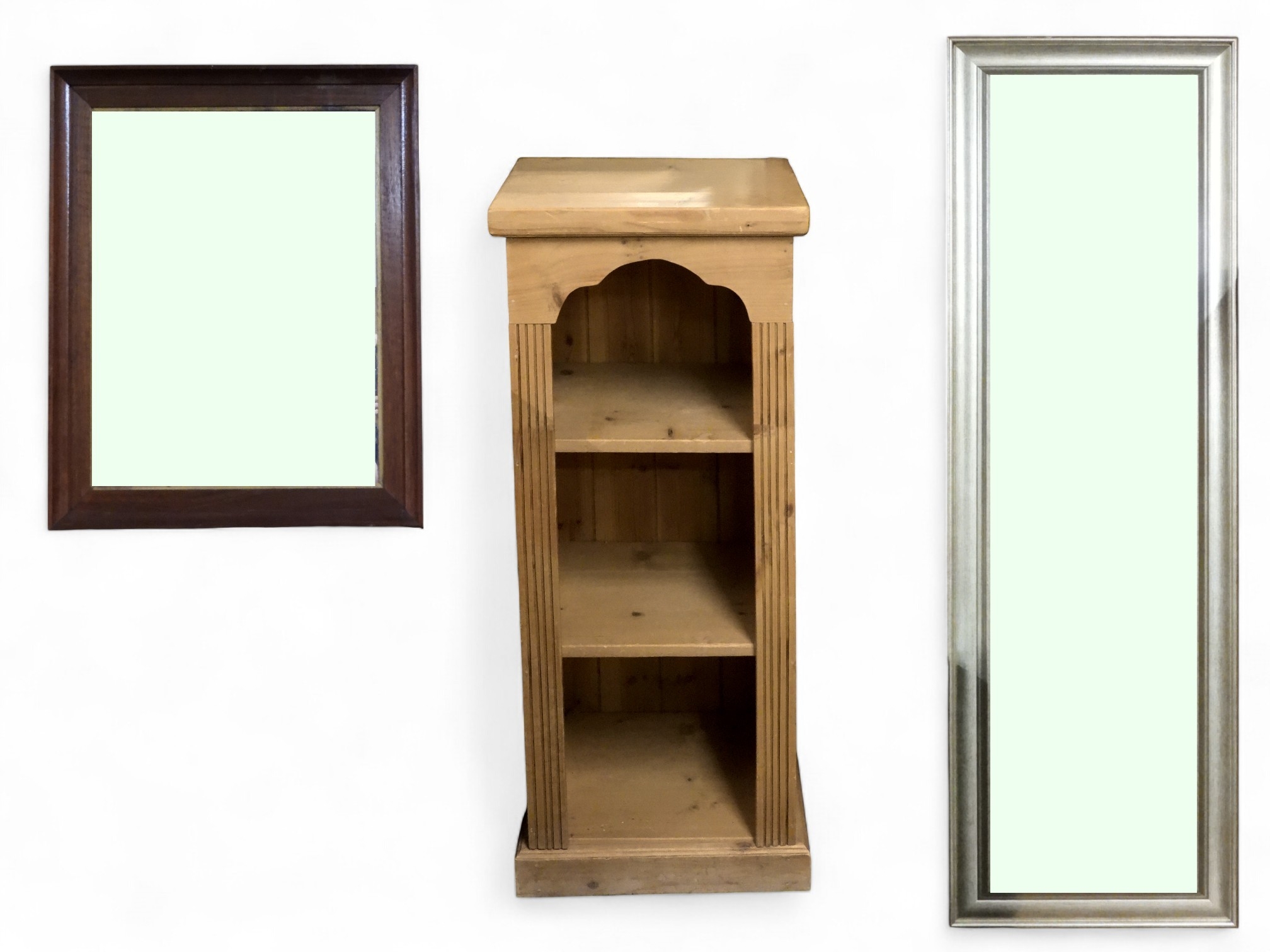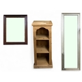 A lot comprising a 20th century pine open bookcase, 92cm high x 38cm wide x 36cm deep, gilt framed bevelled glass wall mirror, 136cm high x 45cm wide and a stained teak framed wall mirror, 74cm high x 60cm wide (3)