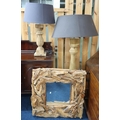 A lot comprising a contemporary driftwood framed wall mirror, 84cm high x 83cm wide, contemporary turned teak standard lamp, 156cm high and accompanying table lamps 79cm high (3)