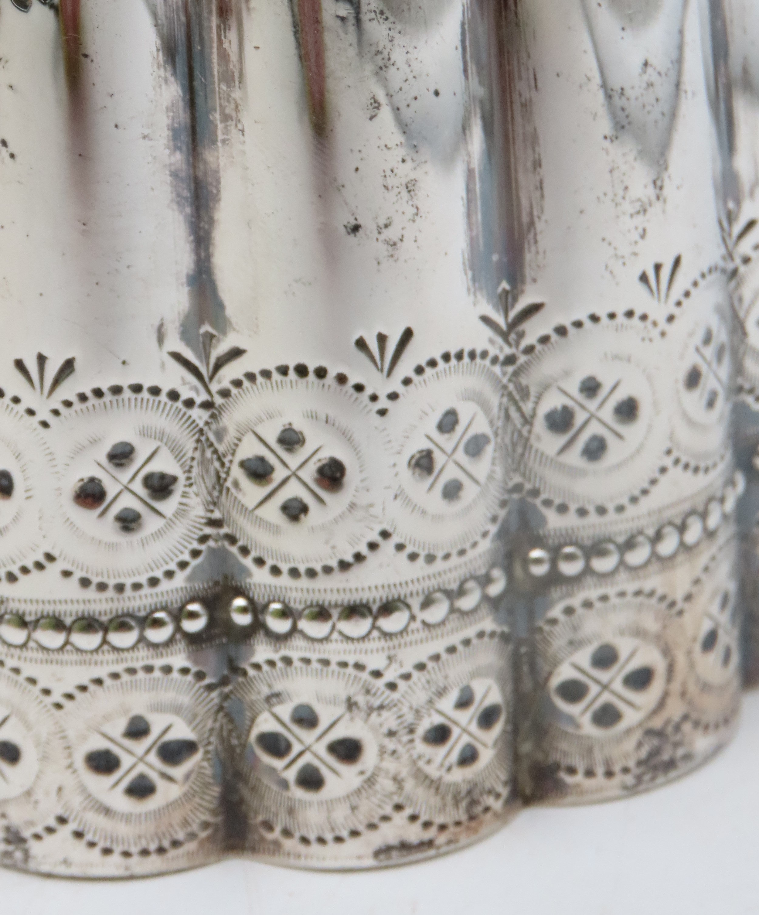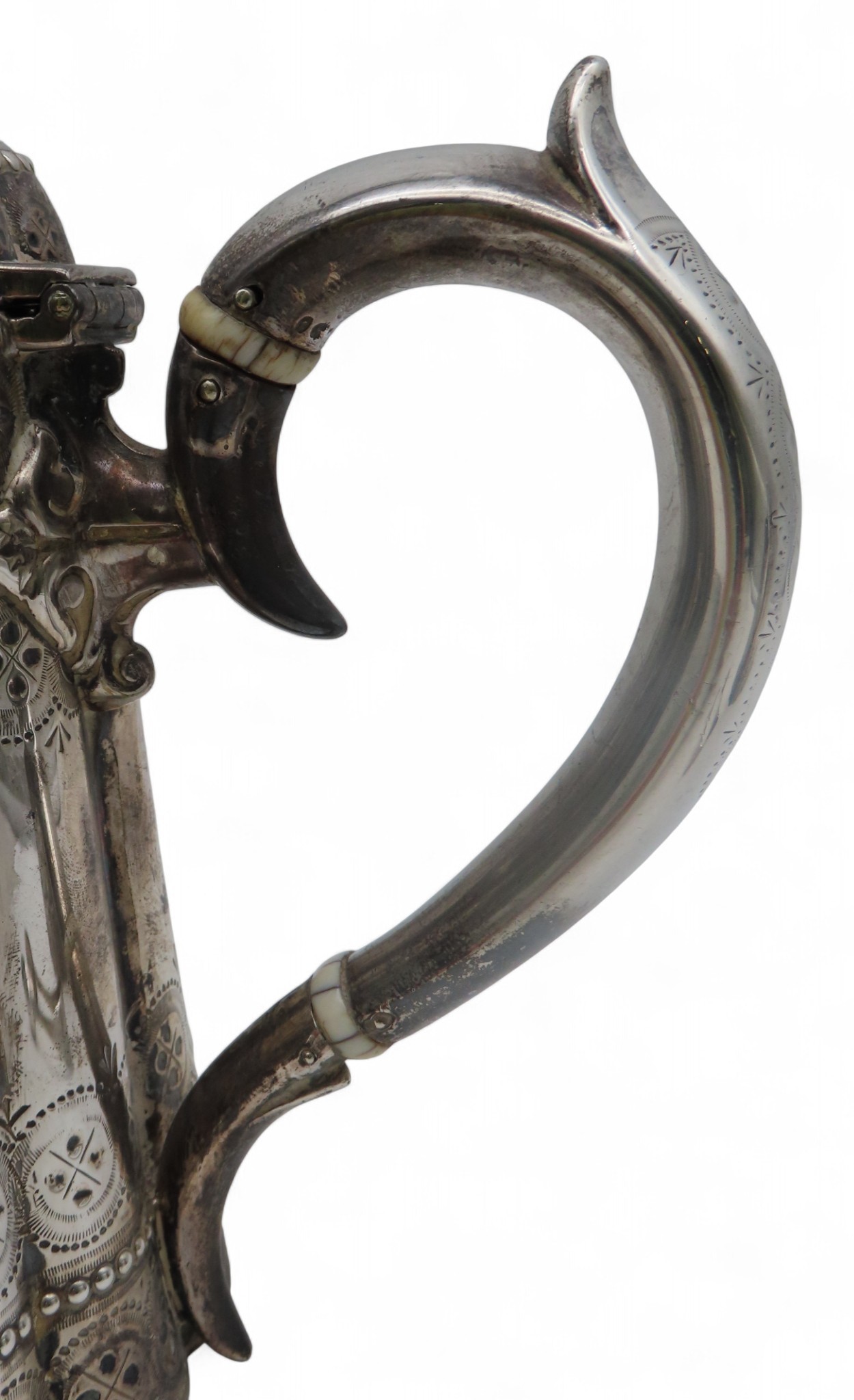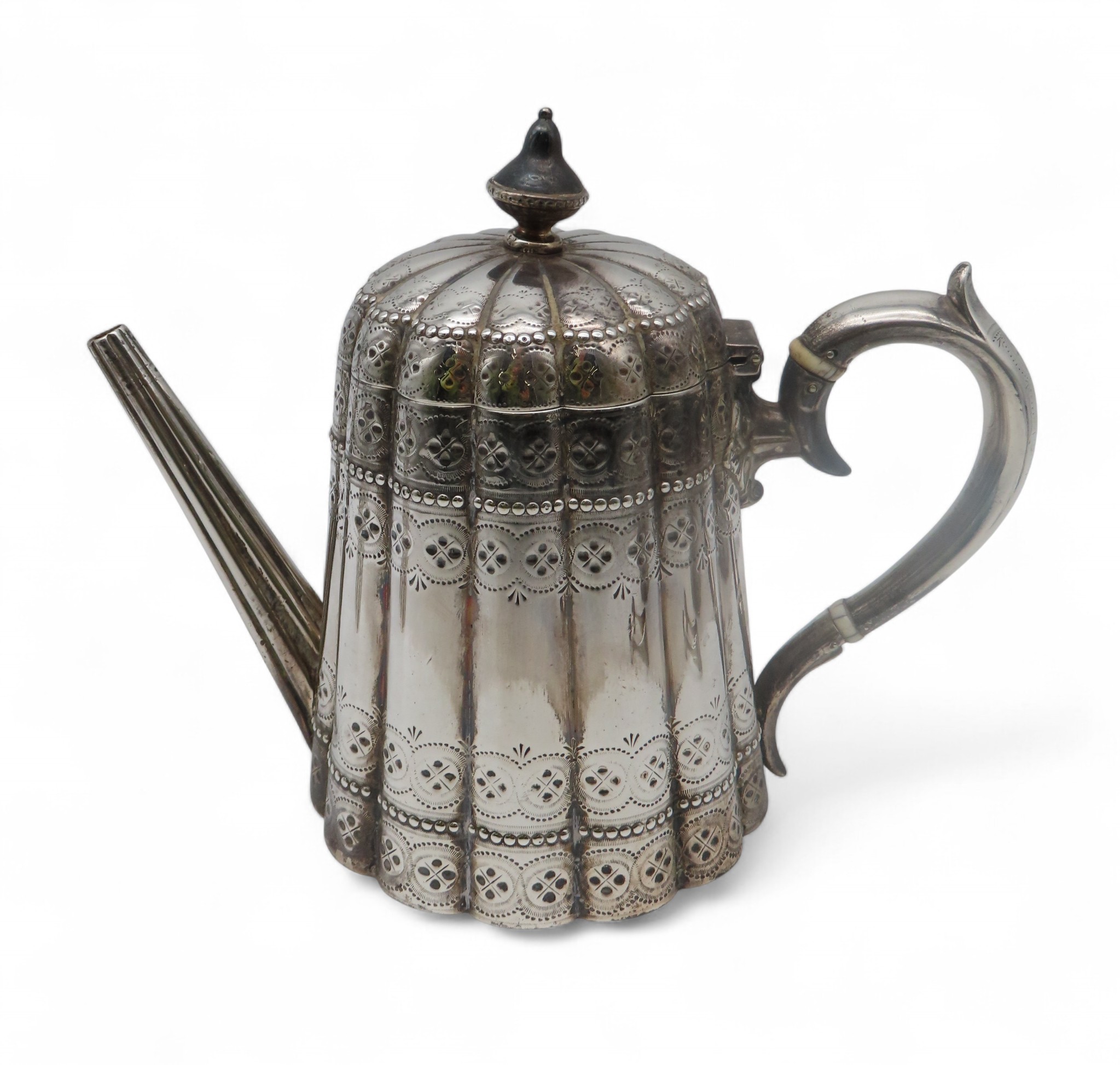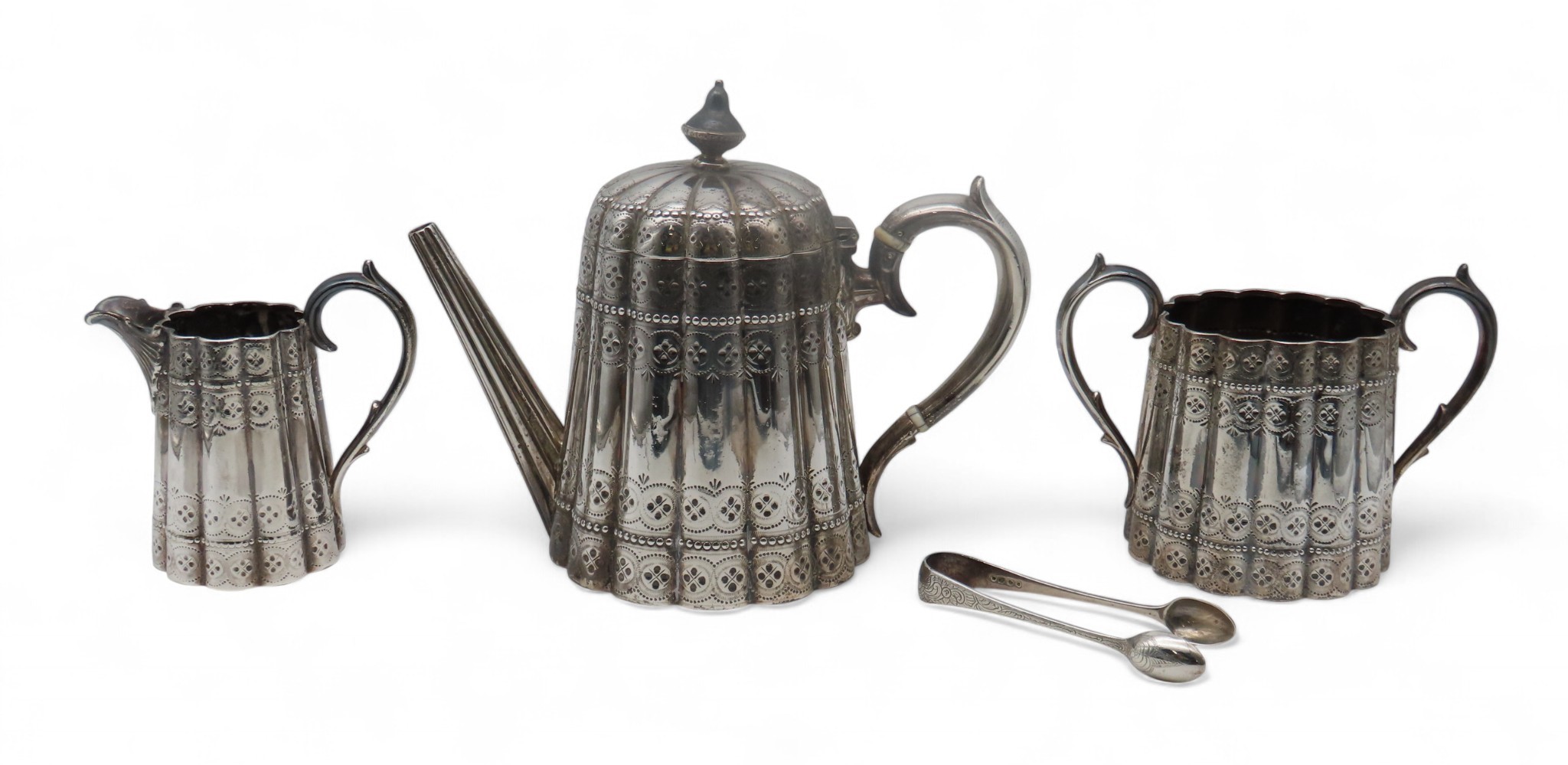 Thomas Bradbury & Sons, London 1875, of lobed form, with engraved geometric banding and beaded banding, with an s-scroll handle, with ivory finials, diamond registration mark to base, and a pair of Victorian silver sugar tongs, maker's mark SS, London 1876, 1,049gms / 33.72oz