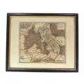 16th century engraved map with contemporary hand colouring, framed under glass, the visible printed area measuring approx. 45cm x 39cm, the frame overall approx. 69cm x 56.5cm