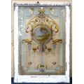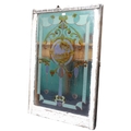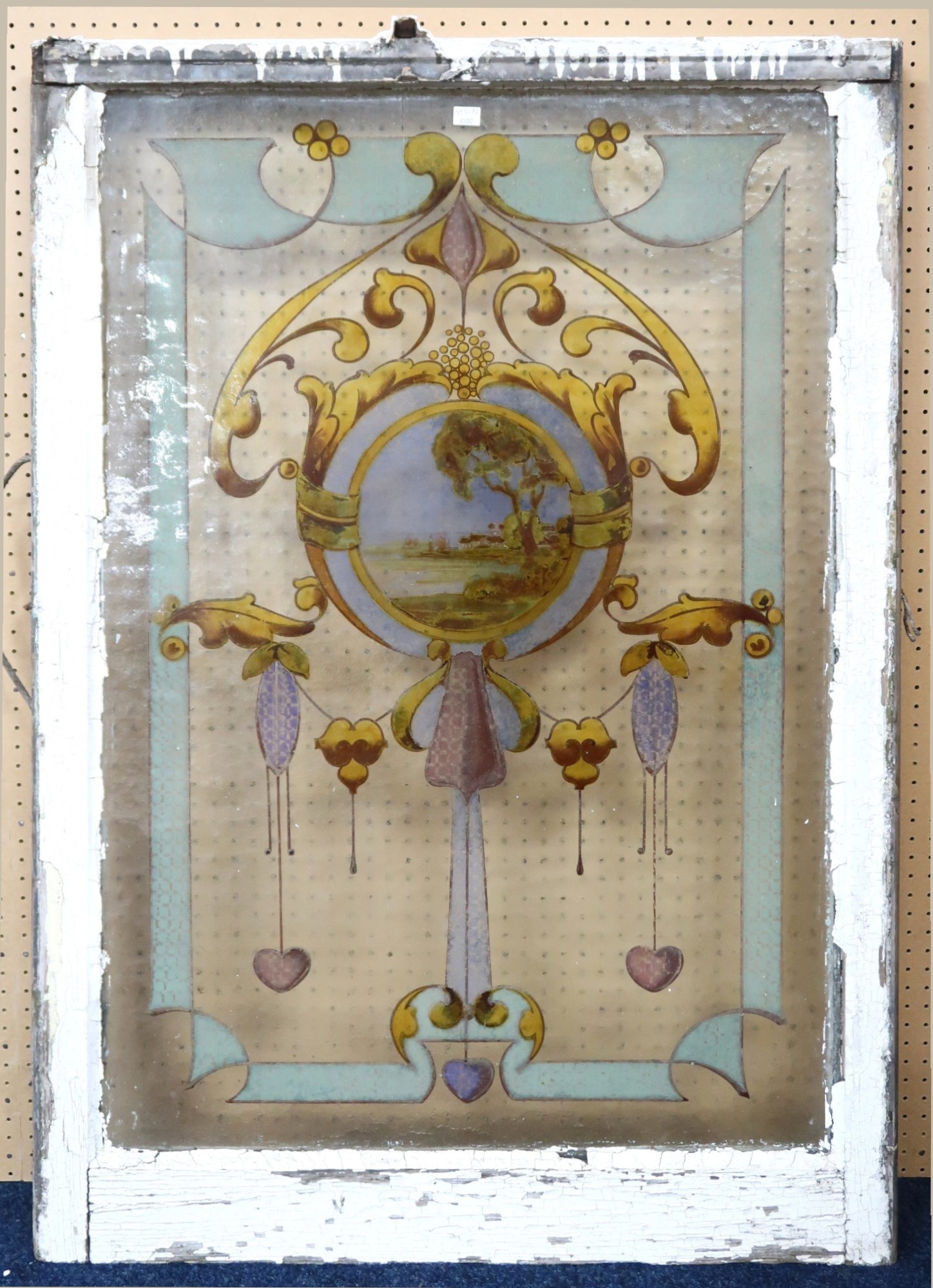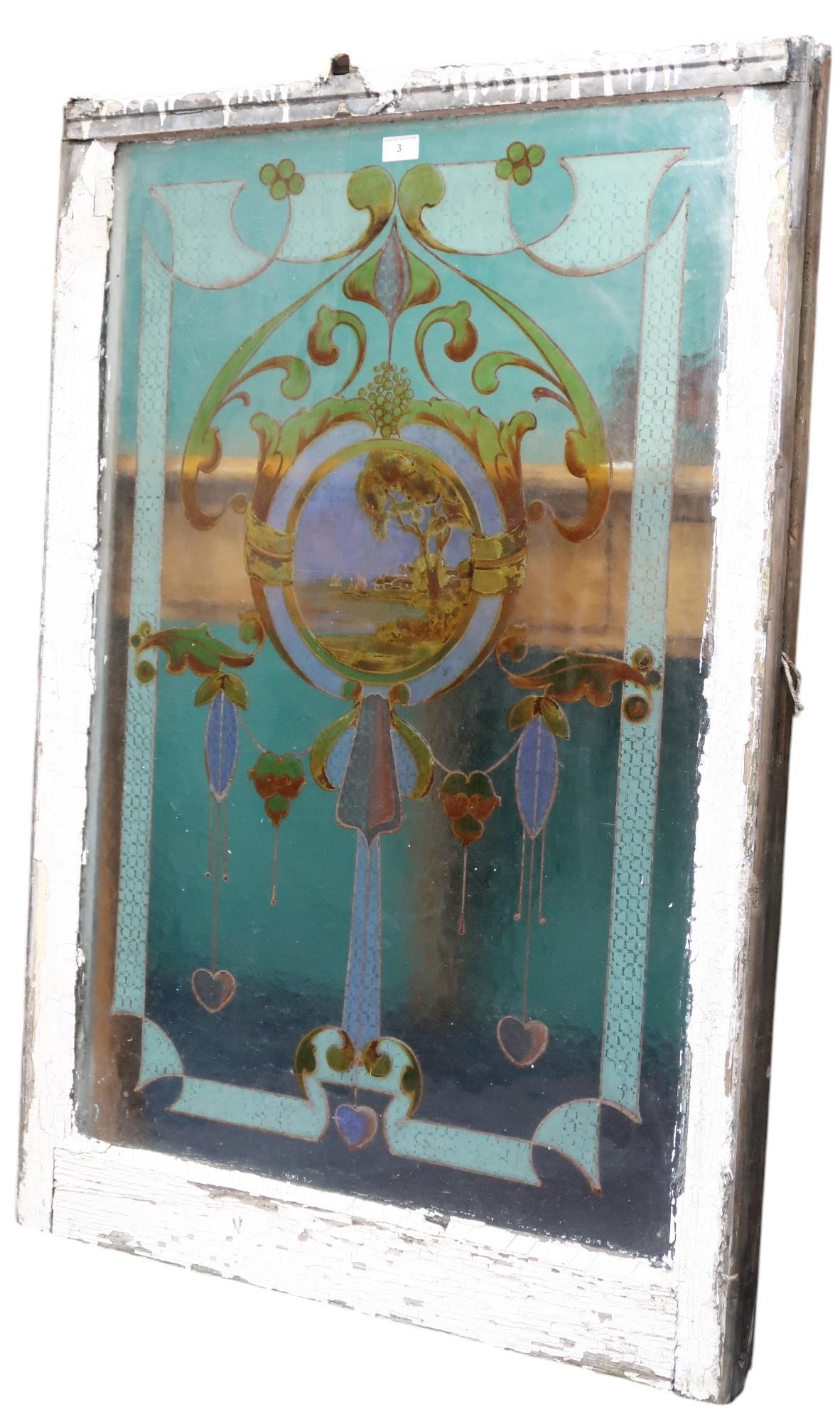 An early 20th century Art Nouveau style sash window with over painted stained floated glass window pane depicting a coastal scene, 114cm high x 79cm wide