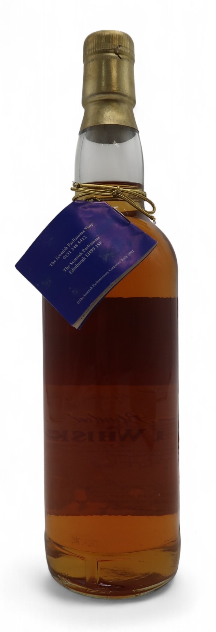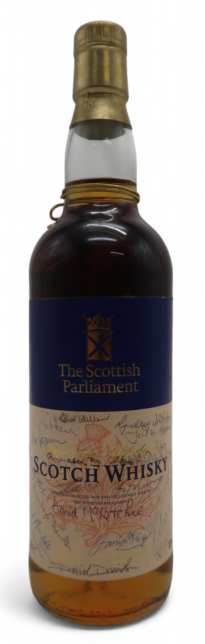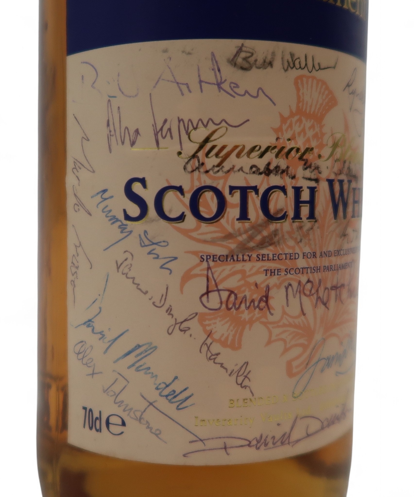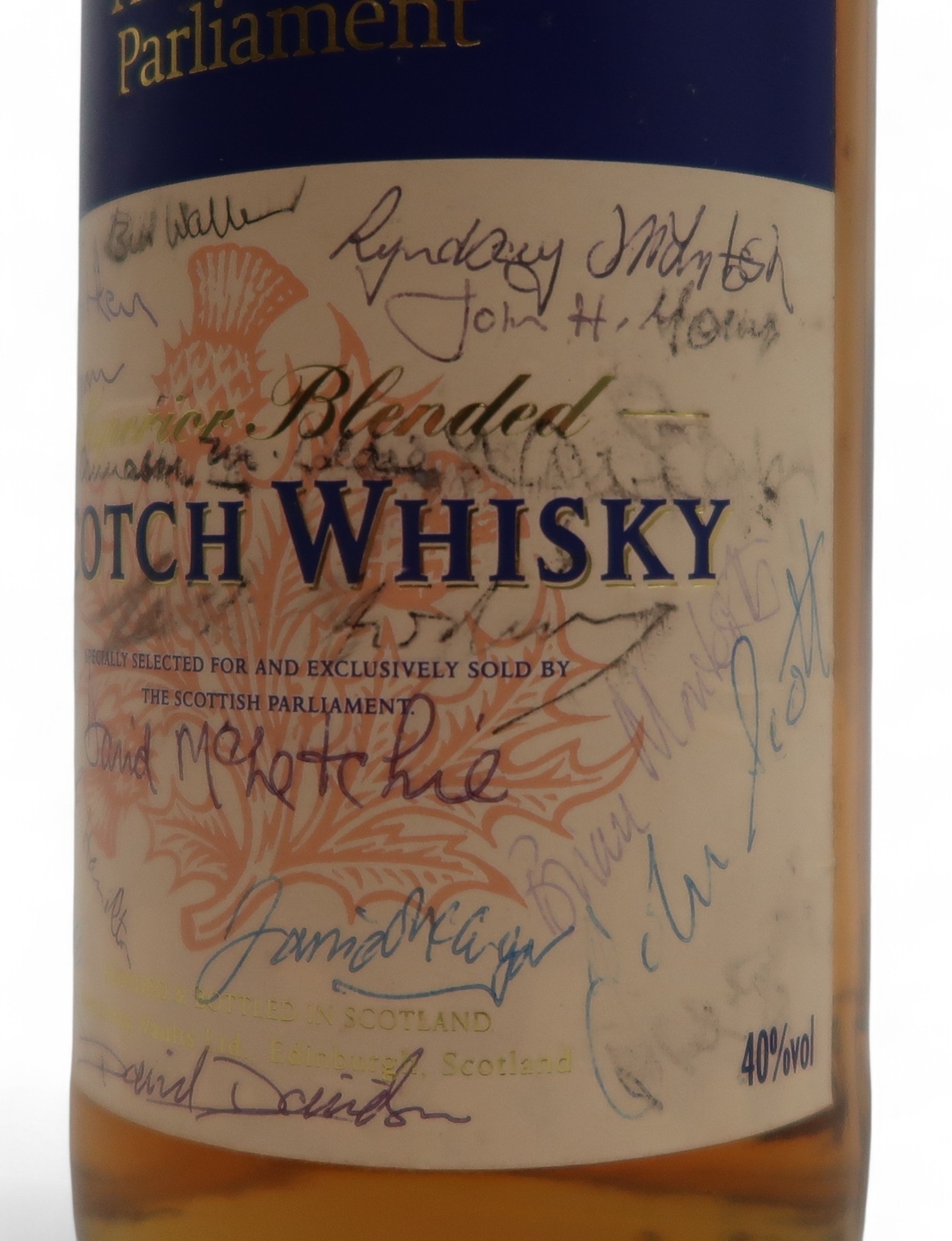 Scottish Parliament Superior Blended Scotch Whisky 70cl e 40% vol, bearing signatures of notable Scottish conservatives including David McLetchie who opposed the introduction of minimum alcohol pricing, David Mundell and Lyndsay June MacIntosh etc