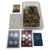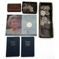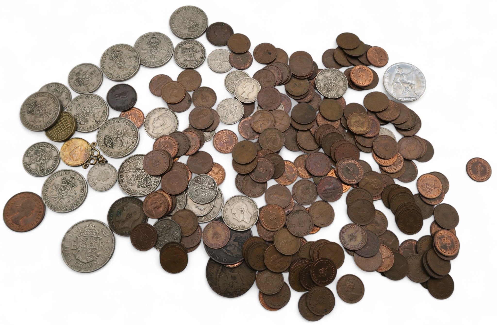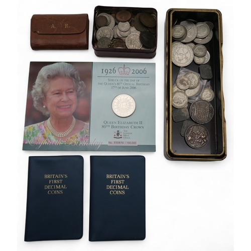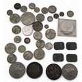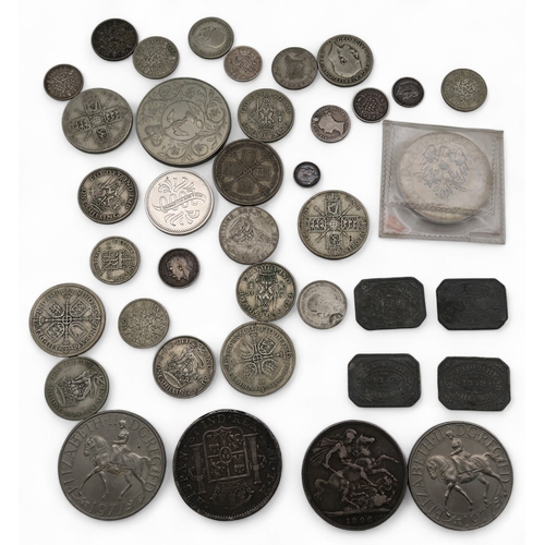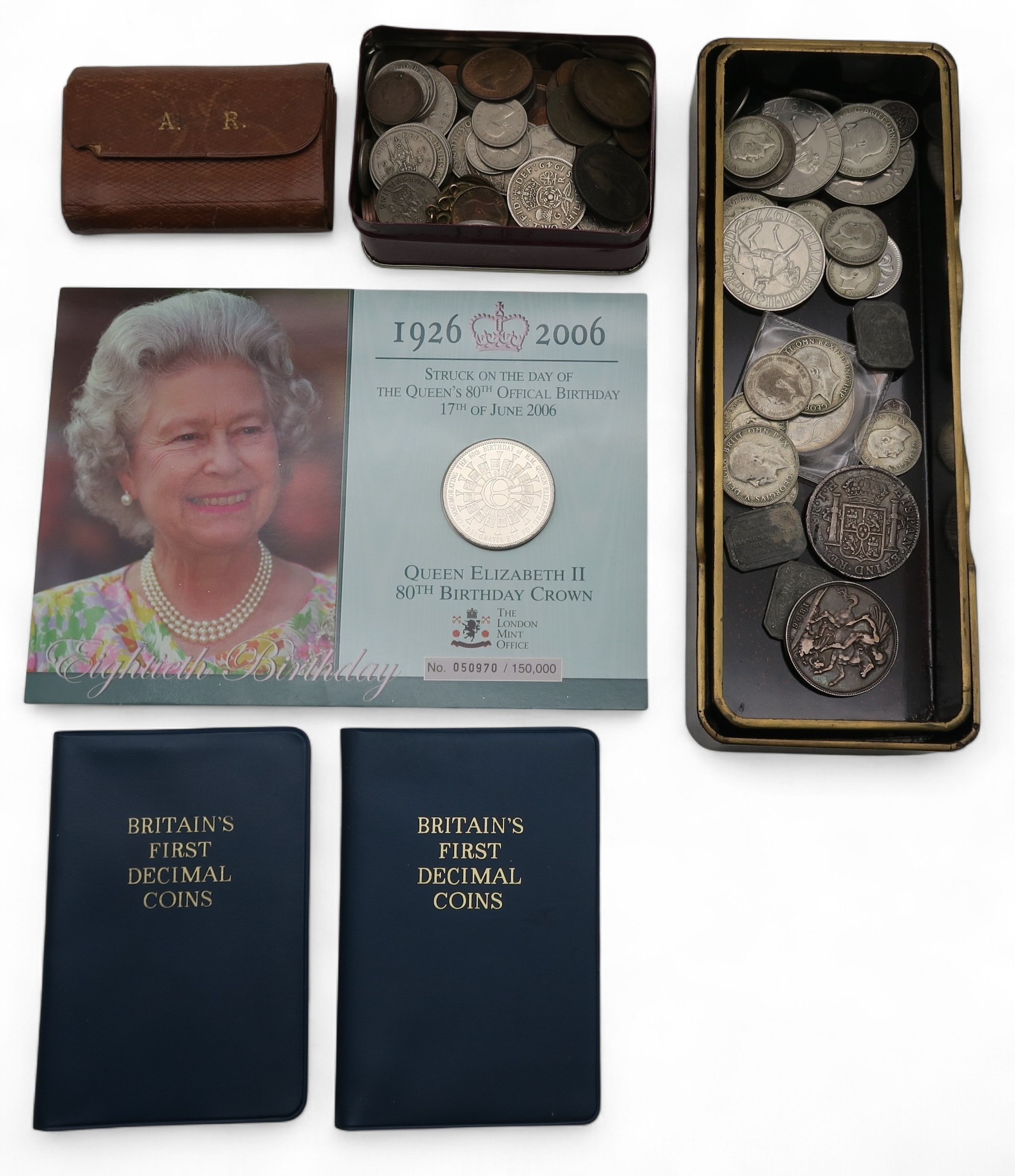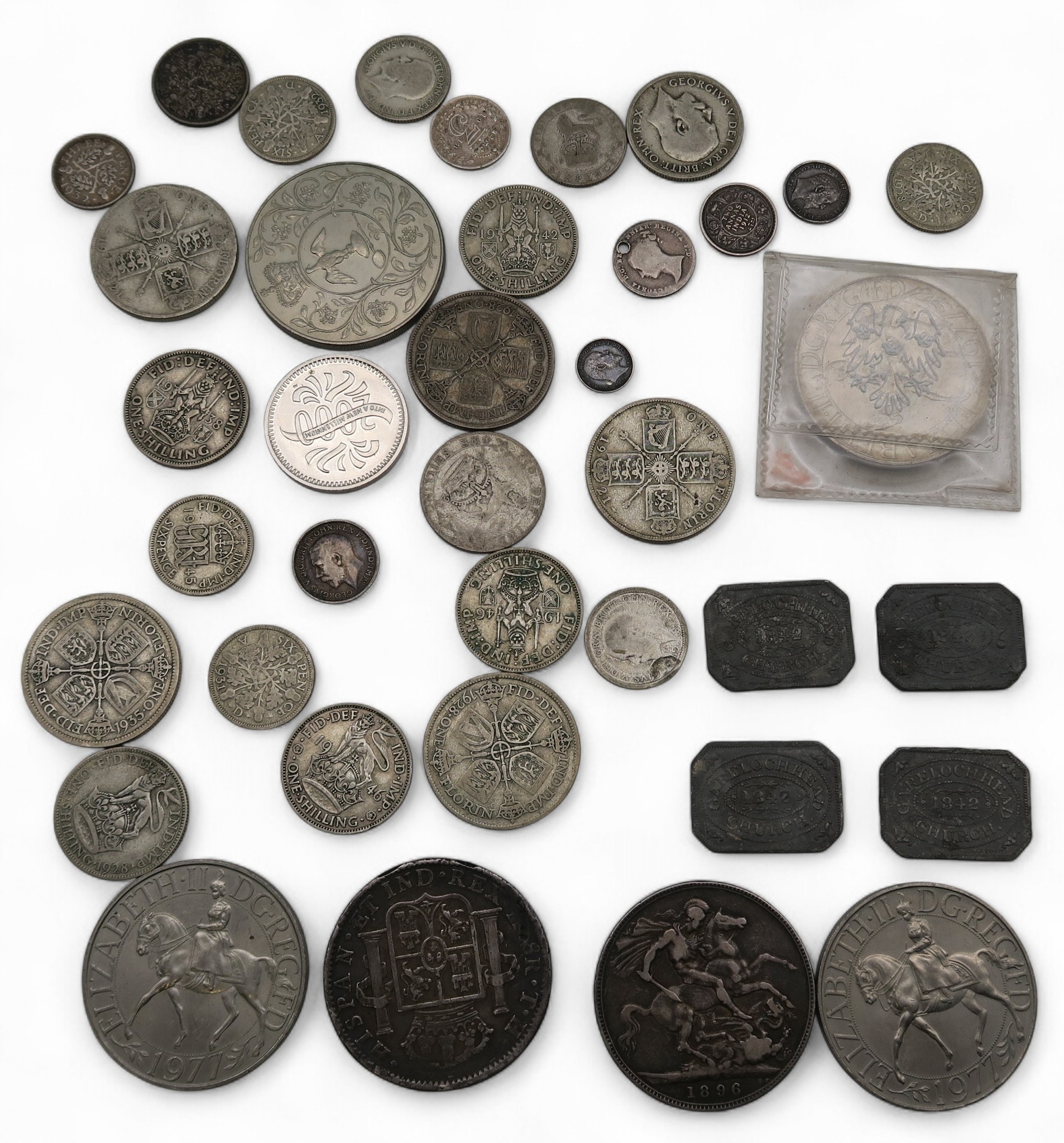 A mixed lot of coins and tokens to include a Victoria crown 1896, a Charles IIII 1804 8 Reales, various pre-1947 GB coins, 1842 church tokens etc