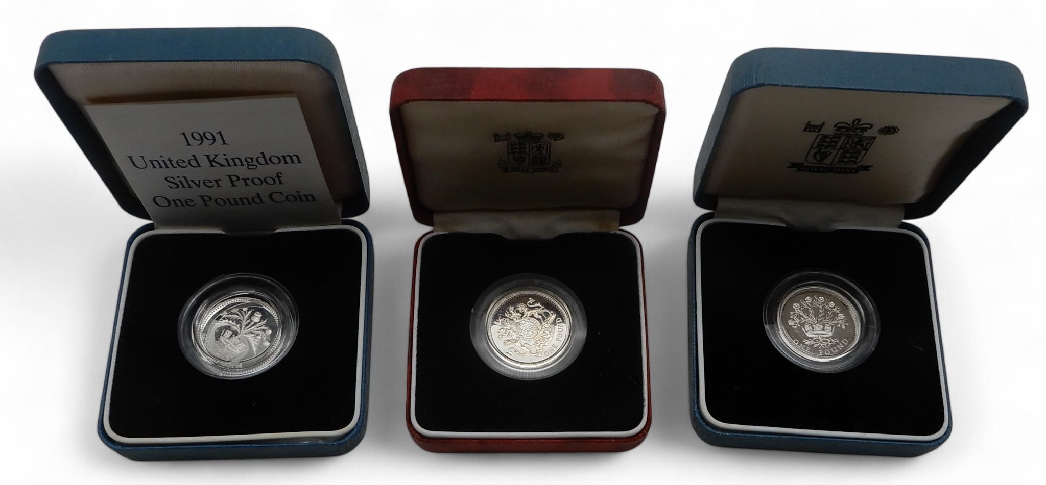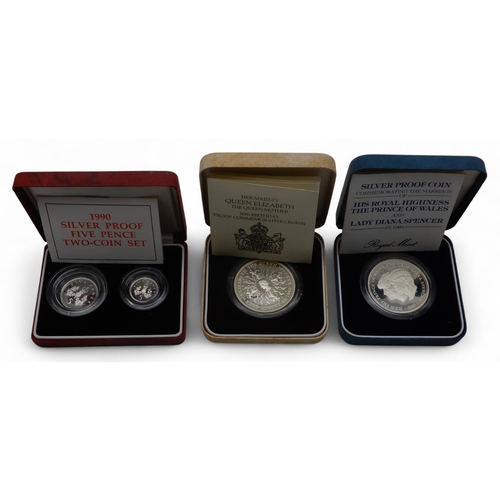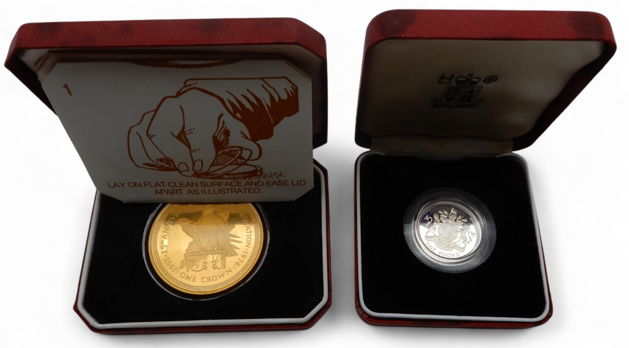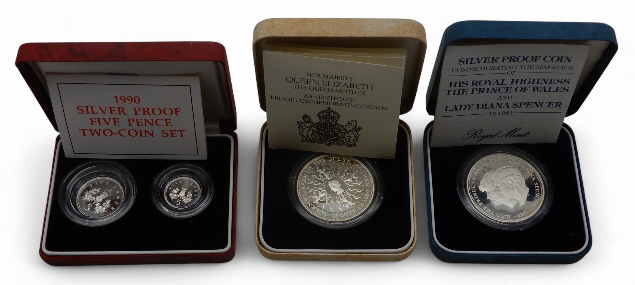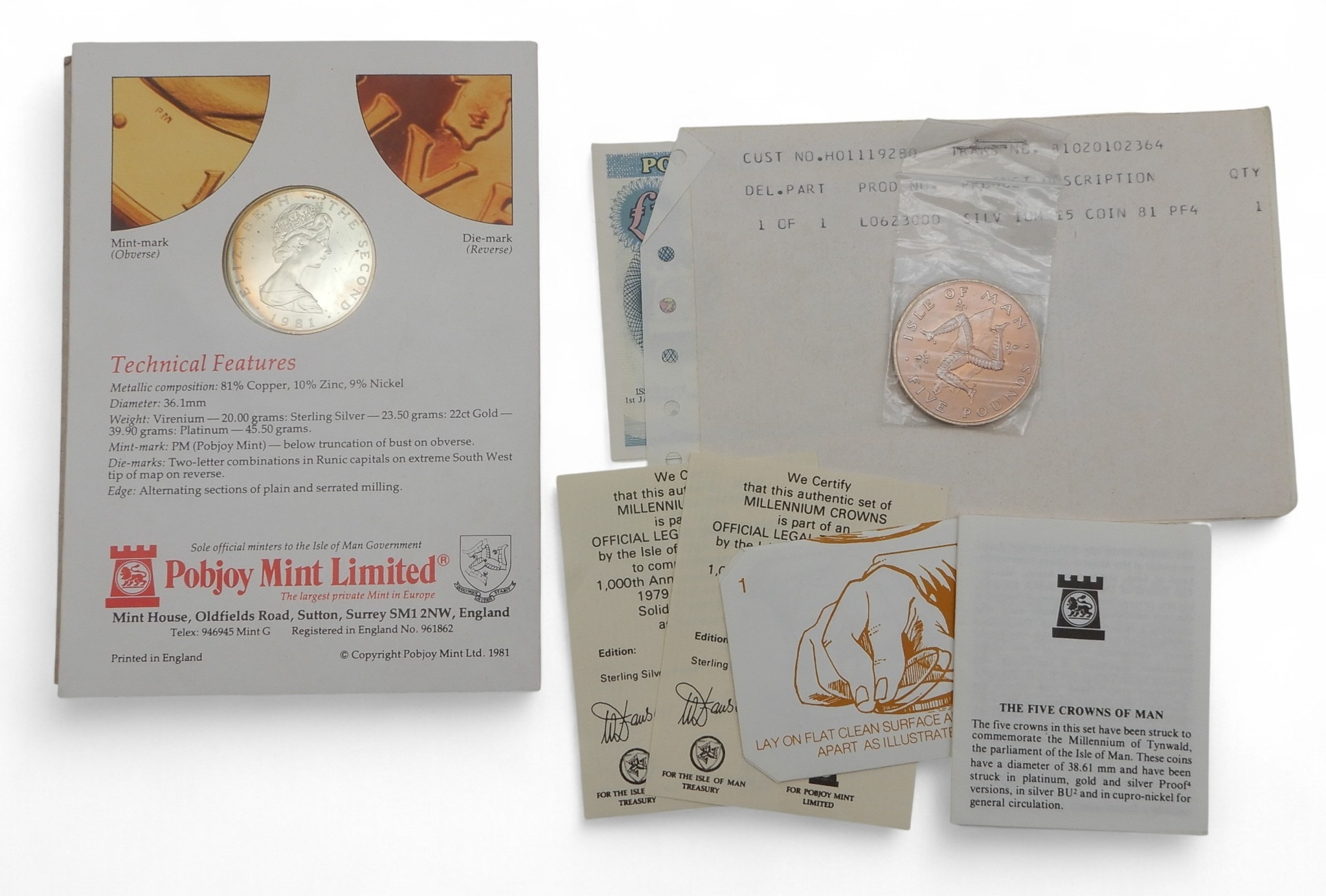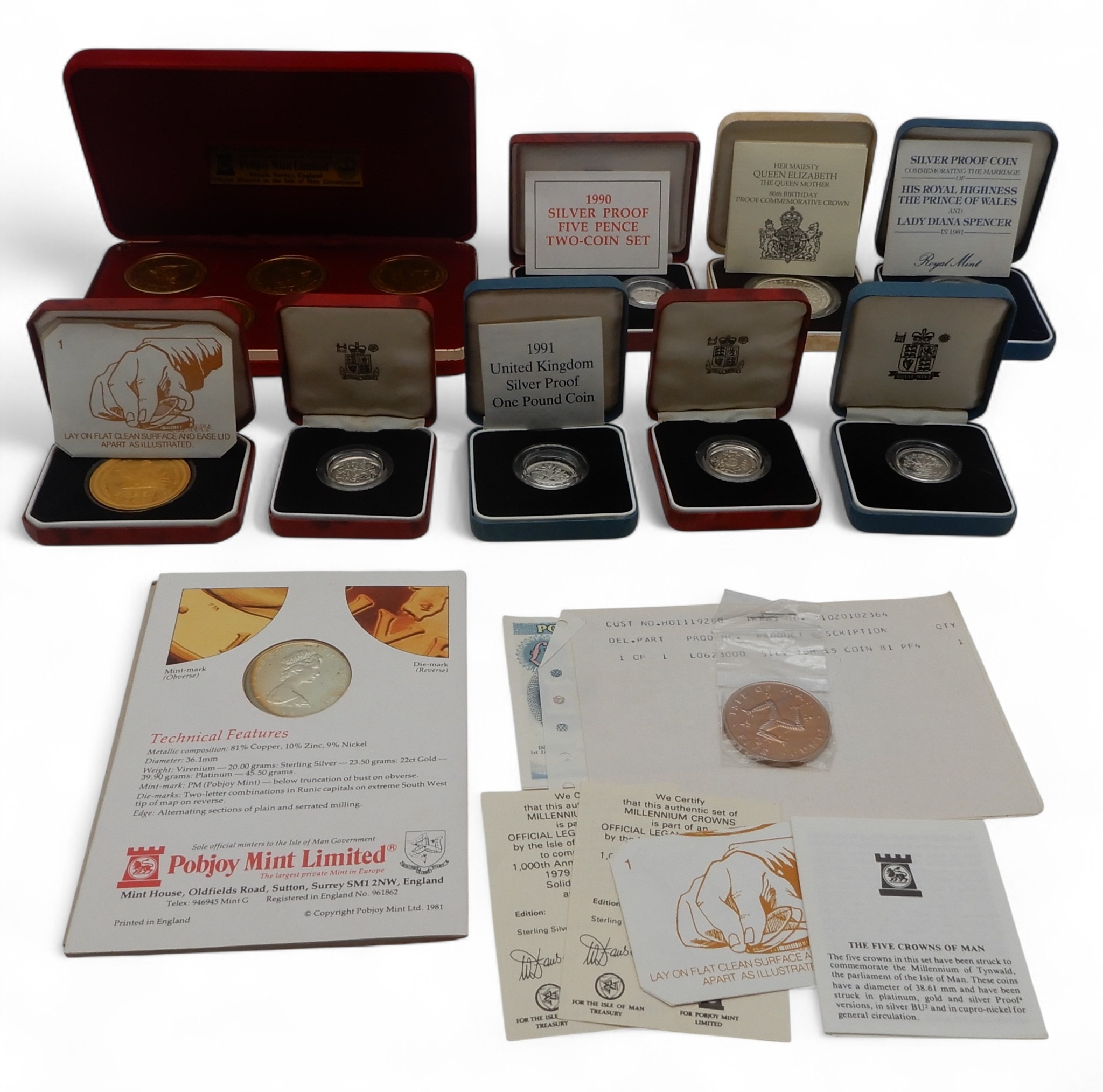 A lot comprising silver commemorative coins to include The Five Crowns Of Man 1979 set, 25th Anniversary of ERII Coronation Crown 1953-1978, Prince Of Wales and Lady Diana Spencer Marriage 1981 etc together with various silver proof £1 coins