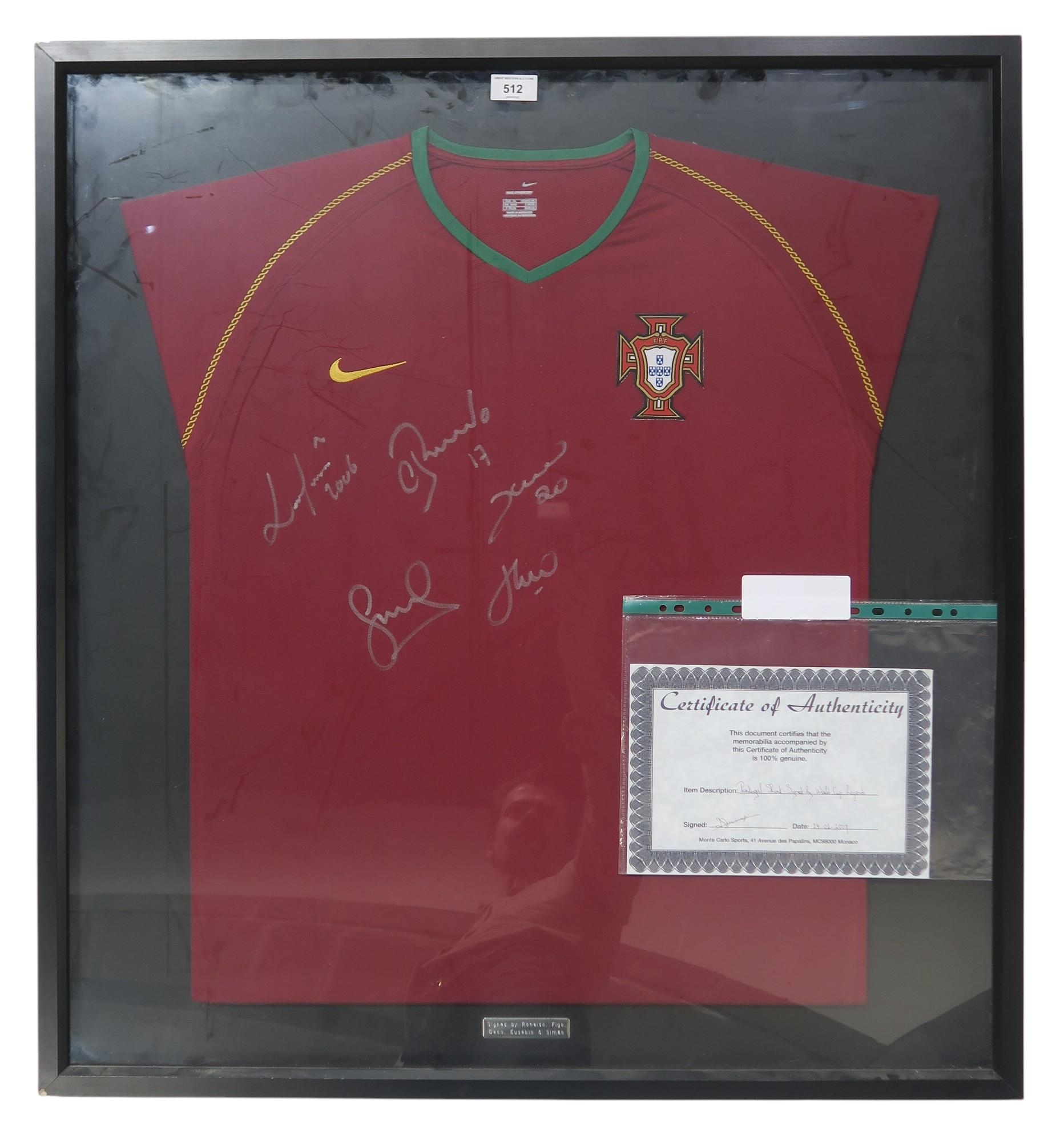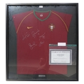 A 2006-08 Portugal Home shirt, signed by Ronaldo, Figo, Deco, Eusebio and Simao; framed under glass, measuring approx. 88cm x 81.5cm externally; with certificate of authenticity from Monte Carlo Sports, Monaco