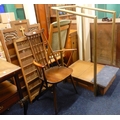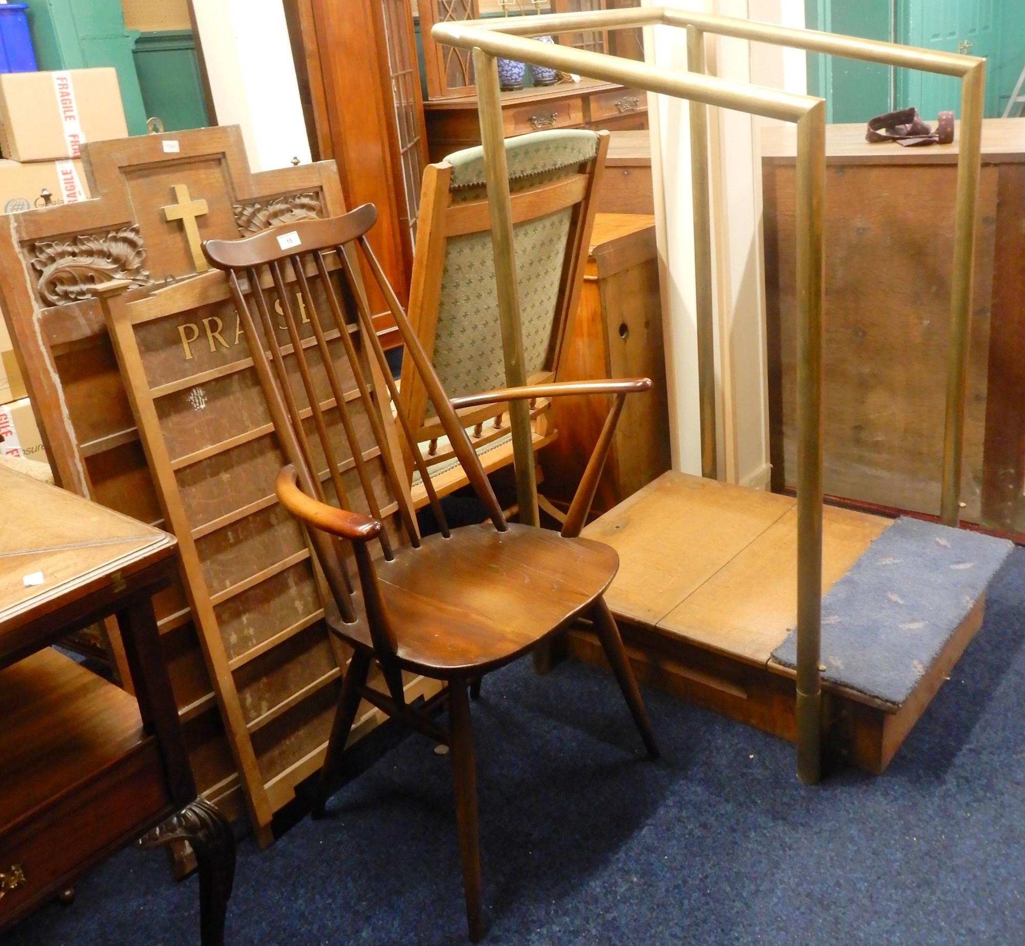 A mixed lot to include an oak and brass speaking podium, two assorted wooden praise boards and an Ercol elm and beech rail back dining carver (4)