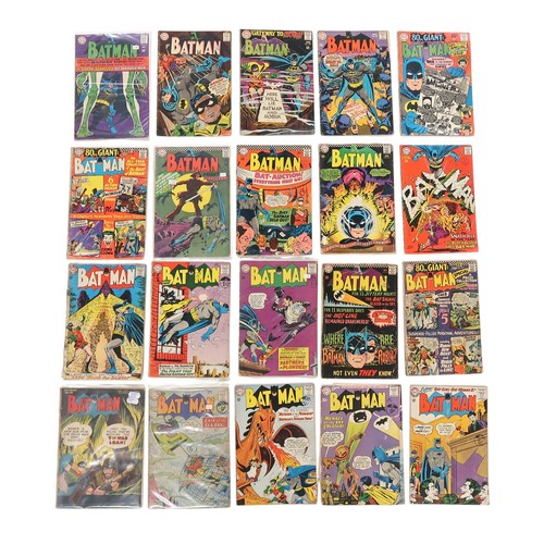 A collection of DC comics including; Detective Comics Batman 282, 293, 312, 330-332, 342-343, 351, 358, 359 (First appearance and origin of Batgirl Barbara Gordon) 368, 372-373, 375-376, 380, 383, 393, 401, 403, 405-409, 411, 413-421, 424-426, 428-433. 435-449, 452-463, 465-468, 470, 477-478, 480-481, 484-490, 493-495, 497-502, 504-507, 512, 514-523, 527, 529-530, 551-552, 554, 556,561, 572, 579, 582, 584-586, 590-594, 597, 599-603, 608-617, 619-623, 626-627, 629-634, 638-640, 643-650, 653-658, 678, 683, 685, 687-688, 690, 697, 704, 708, 715, 717, 740-741, 758-759, 783, 796, Detective Comics Batman Annual 3-5, 7-9, Batman 132, 135, 146, 155 (1st Silver Age appearance of Penguin), Batman 30, 167-169 (Penguin second Silver Age appearance) 184-185, 187, 189 (first Silver Age appearance of Scarecrow), 191-192, 194, 195 (first appearance of Bag O' Bones), 196, 198, 201-202, 205-206, 208-209, 211, 213, 214 (Women's Liberation cover), 215-218, 221, 226, 228-229, 239, 242- 244 (Ra's al Ghul and Talia appearances), 245-250-251 (Classic Joker cover) 256-261, 264-271, 276-281, 283-284, 286-287, 295-296, 298-302, 304-309, 312, 315, 317, 320-322, 325-326, 328-329, 330, 333-336, 339-340, 343-346, 349-352, 354, 356, 358-359 363, 364, 365, 388, 392, 423 (Classic Batman cover), 432, 440, 445-446, 455-459, 461-464, 466-469, 472, 475-476, 478-479, 480-485, 487, 490-491, 500 etc (qty)